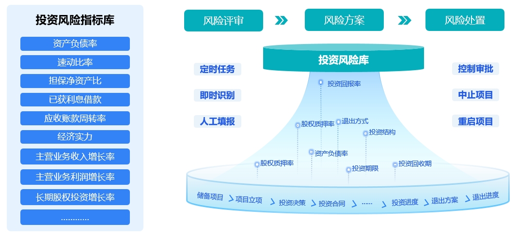 投资管理预制各类型风险点及预警规则,通过定时任务、实时识别、人工填报三种方式从项目全生命周期中扫描投资风险,制定风险处置标准流程,并根据风险处置状态对投资项目形成闭环控制,实现投资风险预警清单化、预警识别智能化、预警处置一体化,以数字化方式降低投资风险发生率。