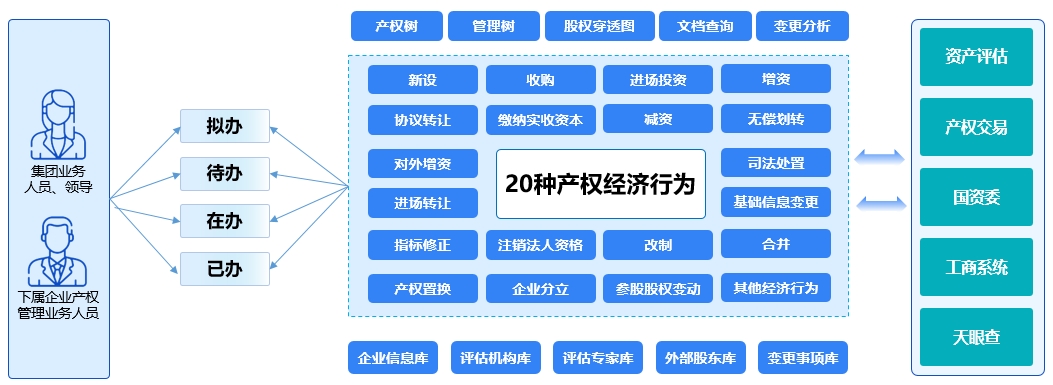 财政部、国务院国资委及相关部门高度重视国有资产交易、流转,多次下发《关于企业国有资产交易流转有关事项的通知》《企业国有资产交易监督管理办法》等文件,对企业经济行为提出严格要求。浪潮海岳投资管理7.0丰富了产权管理系统功能,全面覆盖新设、收购、转让、增资、合并等20种产权经济行为全过程管理,高度匹配国资委产权管理系统业务范围和管控模式,面向央企、省属、市属企业,形成上下贯通、横向协同的一体化业务流程体系,以精细化管理推动国有企业高质量转型发展。