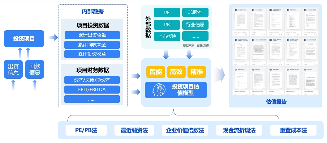 为更加科学、客观的评估投资可行性、比较投资机会、优化资源配置,针对投资项目,预置PE/PB法、最近融资法、企业价值倍数法、现金流折现法和重置成本法五种常用投资项目估值模型,实现投资项目智能估值,辅助投资决策,支撑投资项目科学进退。