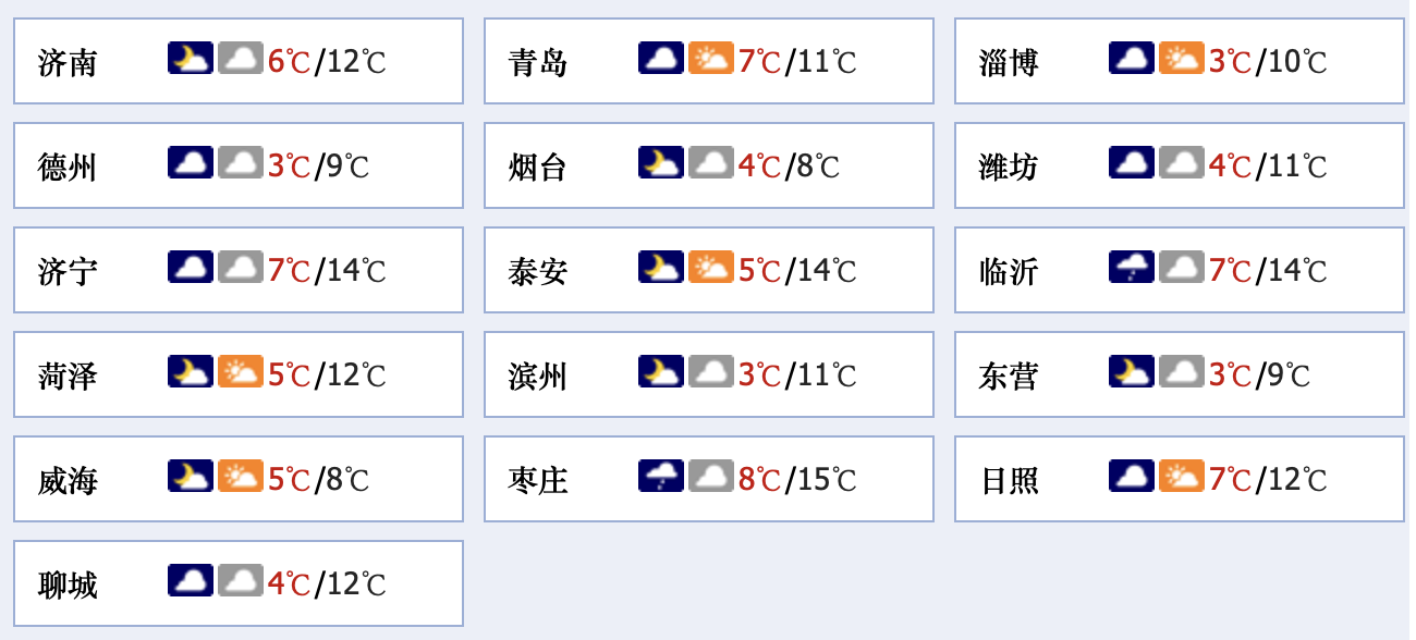 最低气温:泰安、聊城、鲁南和南部沿海地区6℃左右,其他地区3℃左右。