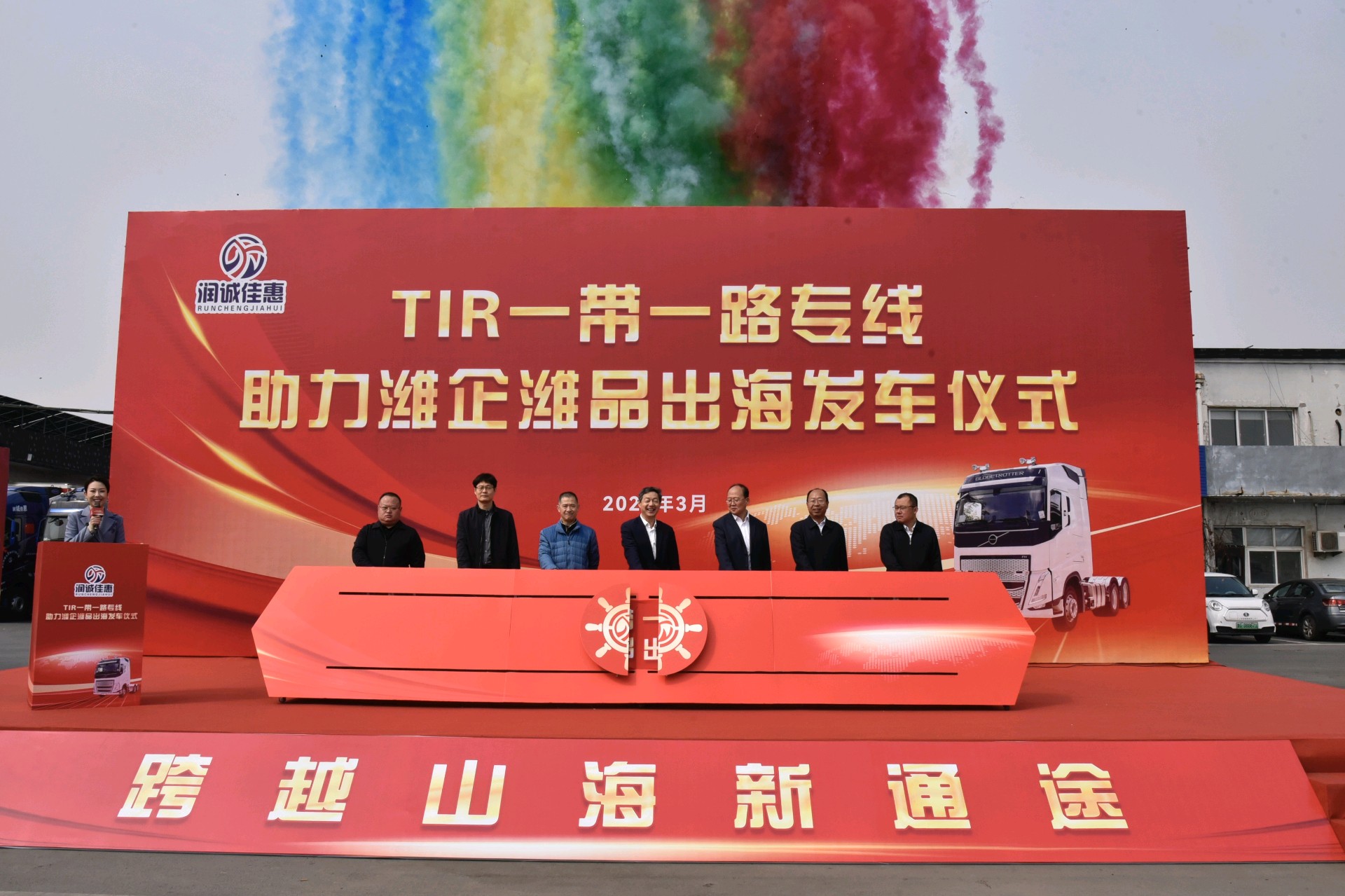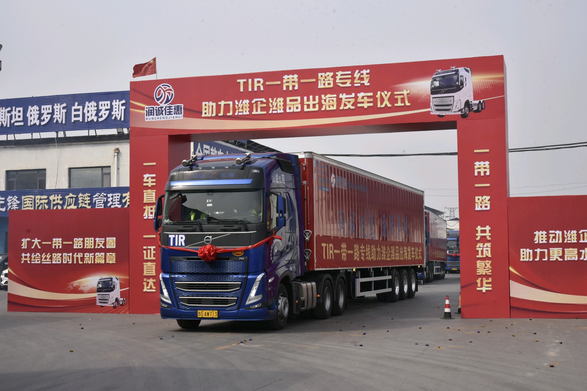 活动现场,潍坊润诚佳惠物流有限公司董事长崔自元介绍了公司发展情况以及公司TIR国际运输业务相关情况,市、区两级有关领导分别致辞发言,随后,与会嘉宾共同上台按下启动开关宣布发车仪式正式启动,伴随着6辆TIR车辆缓缓穿过拱门,驶出企业大门,潍坊坊子至俄罗斯莫斯科“一带一路”TIR专线正式开通。