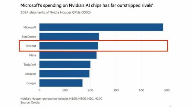 市场研究机构Omdia数据显示,2024年,腾讯订购了约23万颗英伟达AI芯片,购买量仅次于微软和字节跳动。