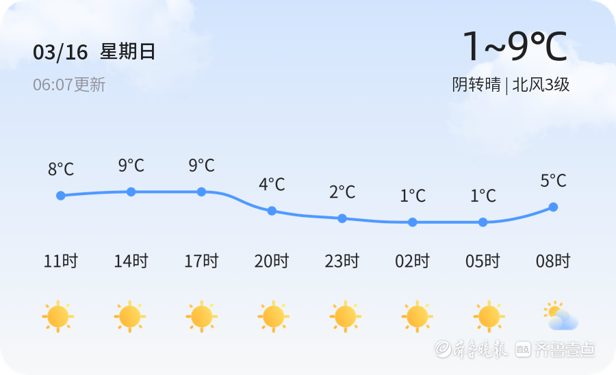 3月16日,农历二月十七,滨州天气由阴转晴,当前气温0.2℃,北风3级,空气湿度92%,空气质量良好,PM2.5指数为39,属于优良水平,适合市民外出活动。但早晚温差较大,最低气温仅1℃,最高气温可达9℃,建议市民穿着保暖衣物,适时增减,以防感冒。出行时请留意风向变化,确保行程安全。