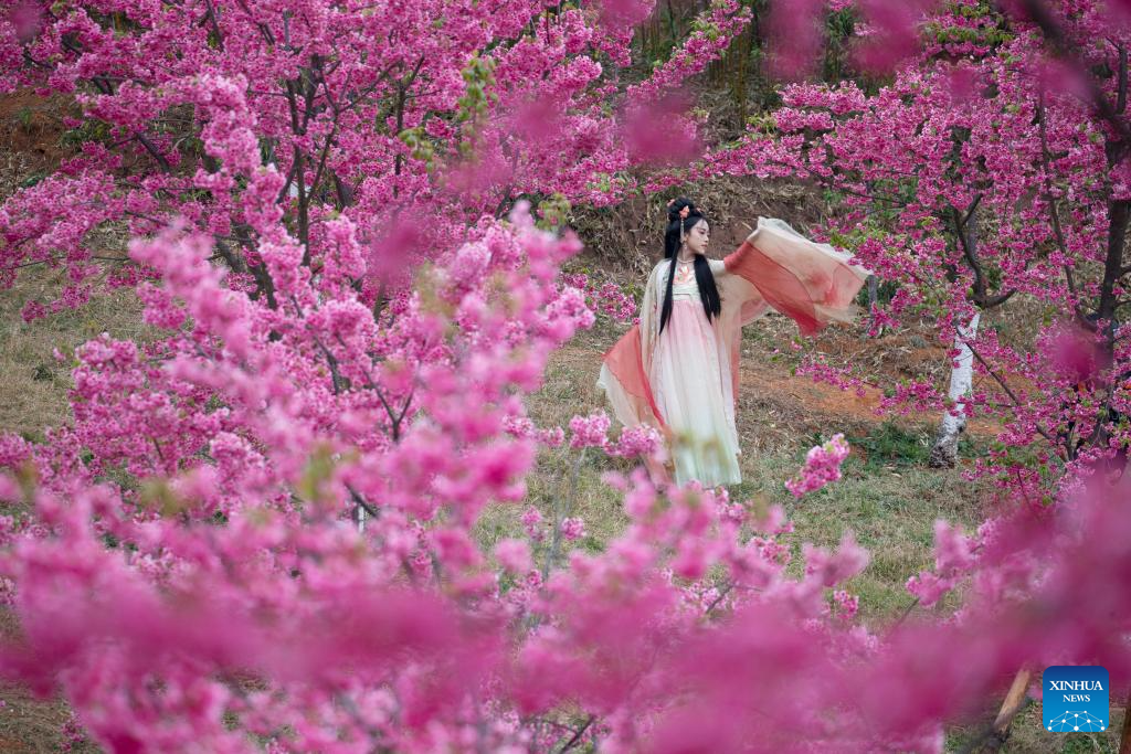 A woman in traditional Chinese clothes poses for photos among blossoms in Malong District of Qujing, southwest China's Yunnan Province, March 15, 2025. As the spring season is coming, flowers are in full bloom across the country. (Photo by Yang Junpeng/Xinhua)
