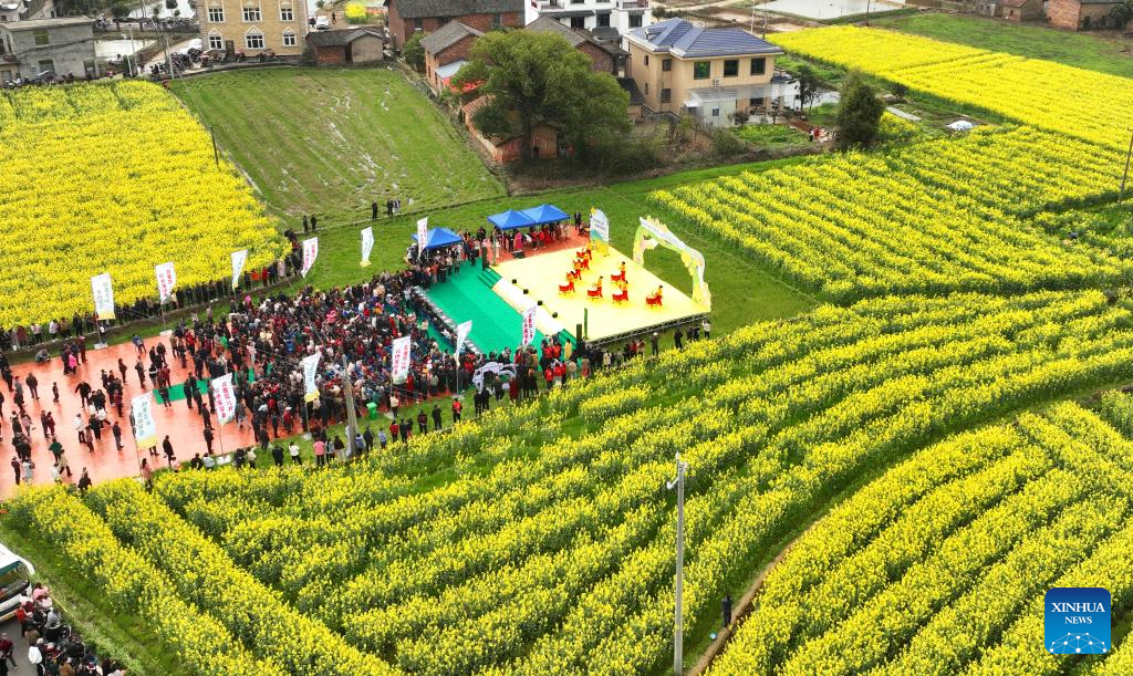 An aerial drone photo taken on March 16, 2025 shows tourists enjoying performance among canola flowers at Shanqiao Town of Hengyang County, central China's Hunan Province. As the spring season is coming, flowers are in full bloom across the country. (Photo by Cao Zhengping/Xinhua)