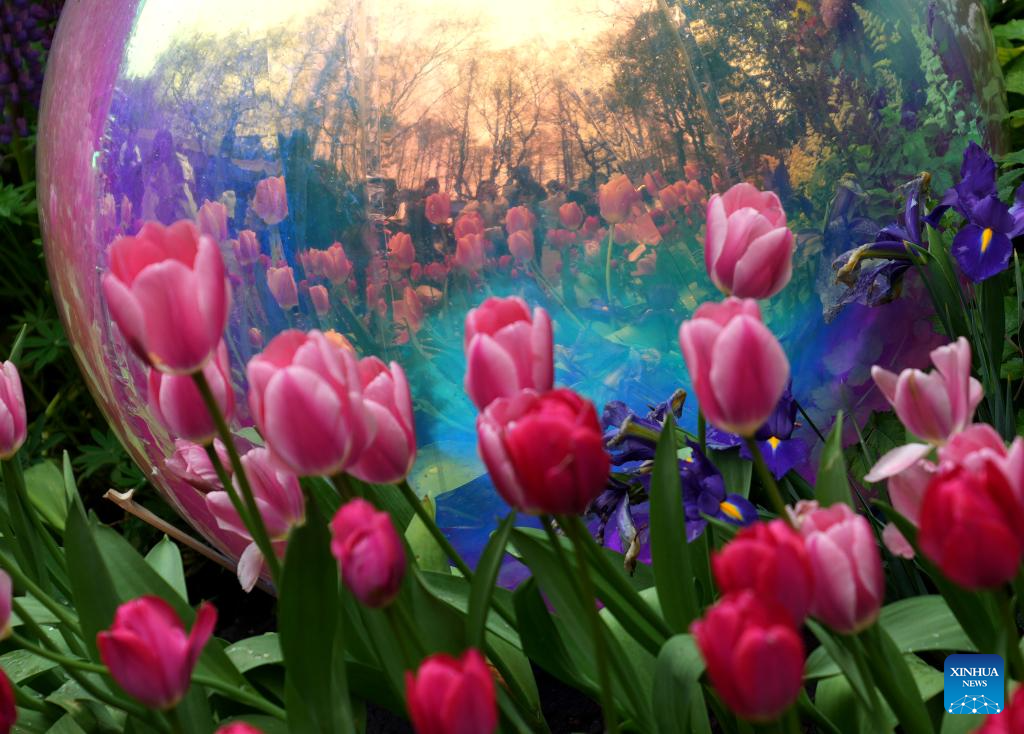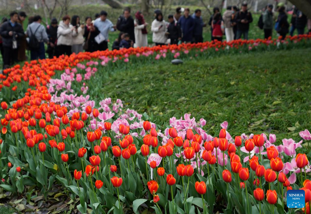 Tourists walk past tulips at Taiziwan Park in Hangzhou, east China's Zhejiang Province, March 16, 2025. As the spring season is coming, flowers are in full bloom across the country. (Xinhua/Han Chuanhao)