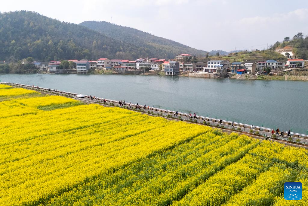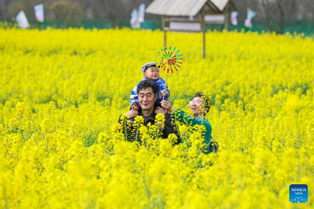 Tourists are pictured among canola flowers in Meihua Village of Xidu Town in Hengyang County, central China's Hunan Province, March 16, 2025. As the spring season is coming, flowers are in full bloom across the country. (Photo by Liu Xinrong/Xinhua)