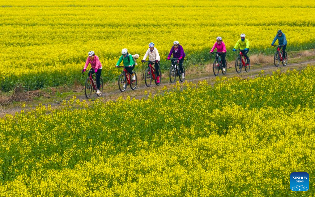 A drone photo taken on March 16, 2025 shows people cycling among canola flowers in Fanchang District of Wuhu City, east China's Anhui Province. As the spring season is coming, flowers are in full bloom across the country. (Photo by Xiao Benxiang/Xinhua)