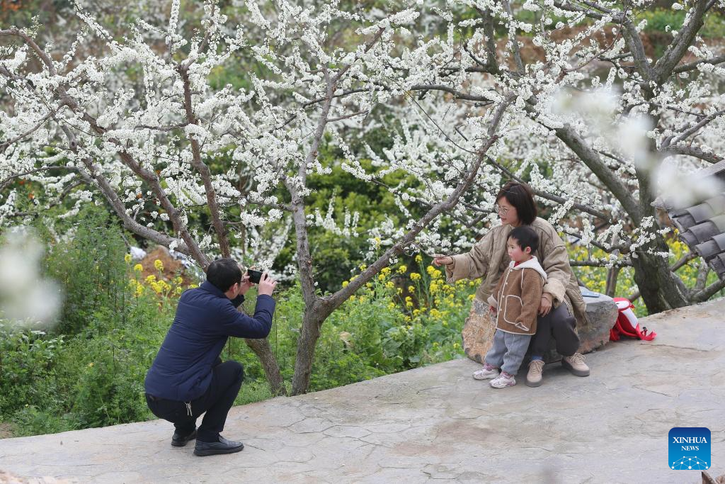 Tourists take photos among blossoms in Quchi Township of Wushan County, southwest China's Chongqing, March 15, 2025. As the spring season is coming, flowers are in full bloom across the country. (Photo by Lu Xianqing/Xinhua)
