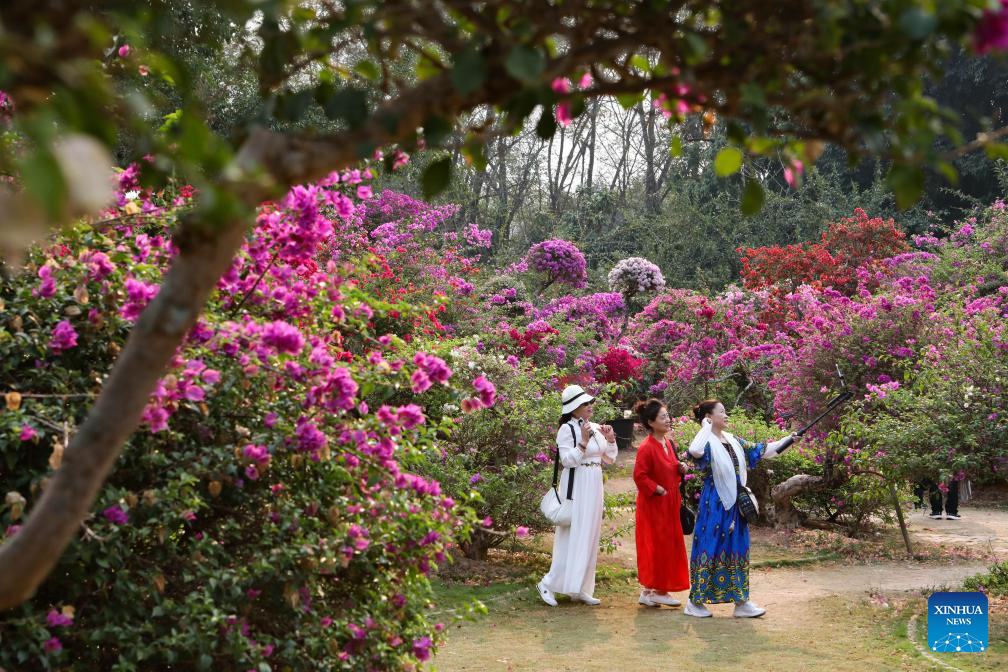 Tourists take selfies at the tropical flowers and plants garden in Xishuangbanna, southwest China's Yunnan Province, March 16, 2025. As the spring season is coming, flowers are in full bloom across the country. (Photo by Li Yunsheng/Xinhua)