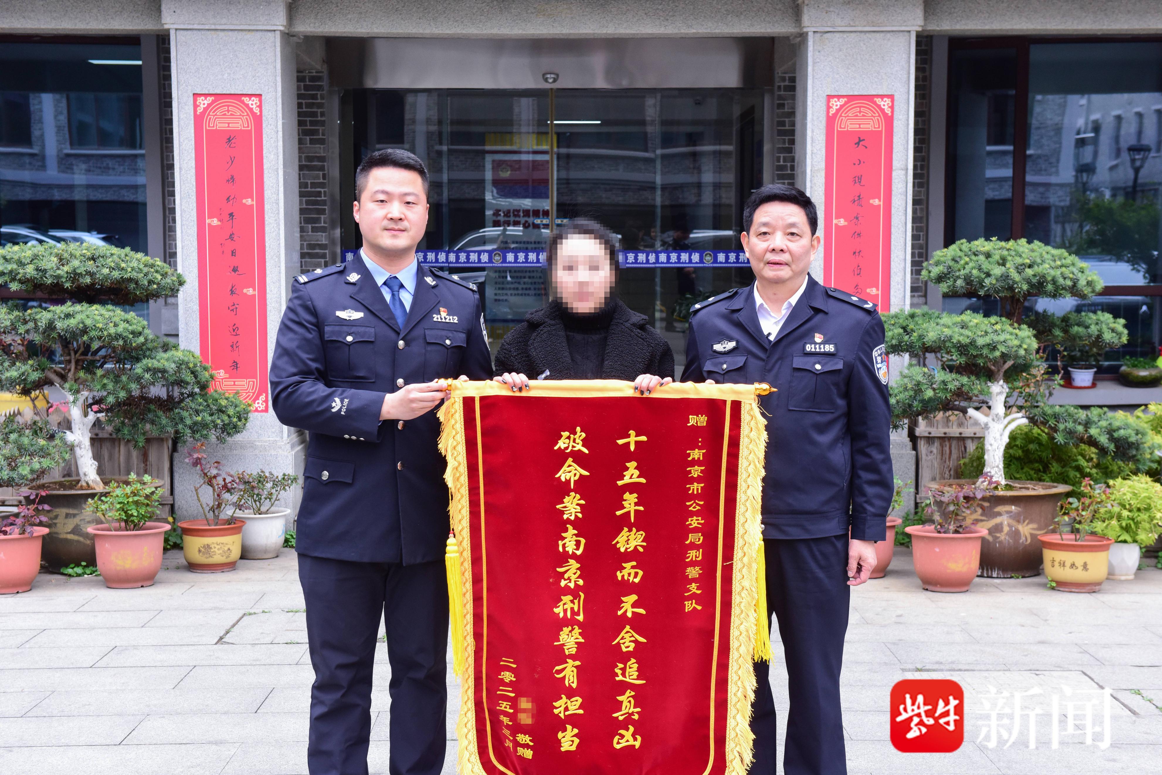 3月14日上午,受害人家属专程来到南京市公安局刑警支队,将印有“十五年锲而不舍追真凶 破命案南京刑警有担当”的锦旗,赠送给警方并表示感谢。