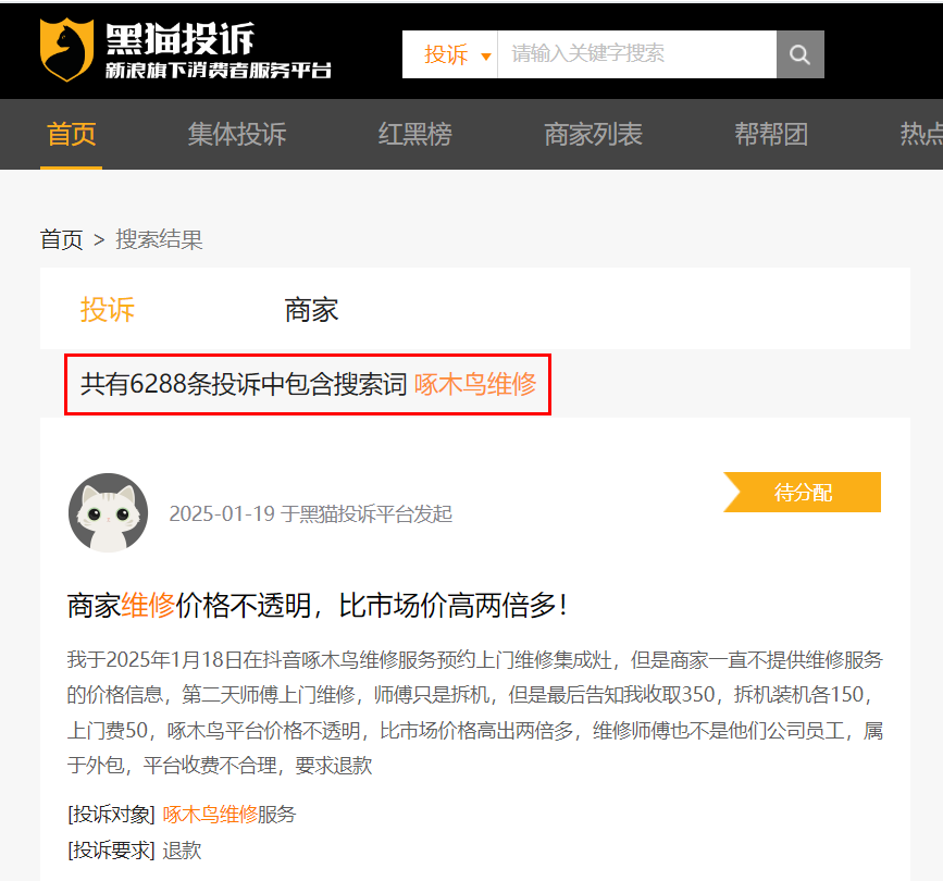 黑猫投诉平台数据显示,啄木鸟维修累计投诉量已超6000条