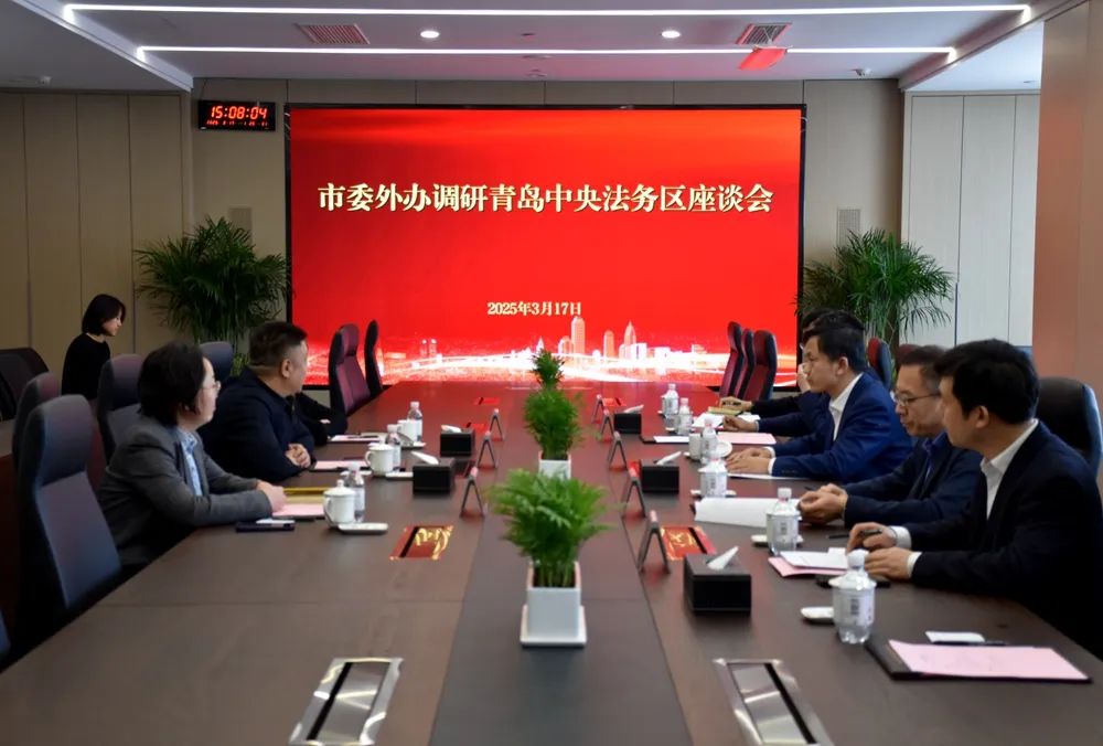 3月17日下午,青岛市委外办主任范奇志带队到青岛中央法务区调研并进行座谈。青岛市委政法委副书记江志浩、市法学会专职副会长殷静陪同。