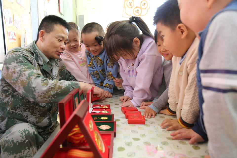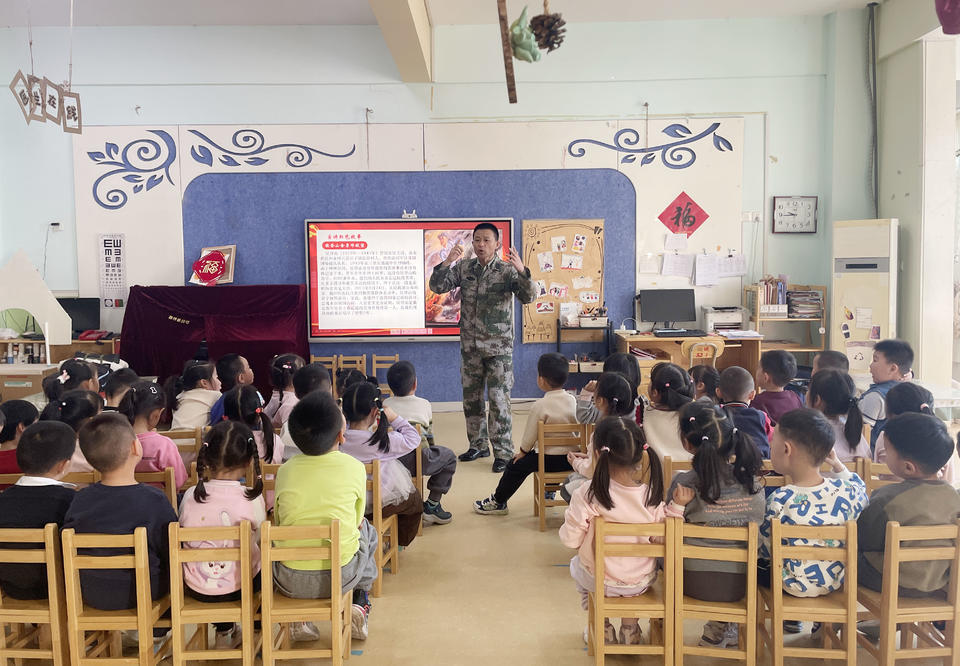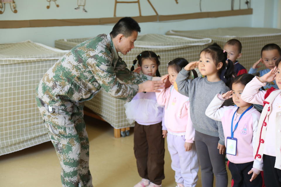 军事技能教学将课堂推向高潮。李鹏辉分解示范的“三大步伐”引起孩子们的浓厚兴趣,稚嫩的“一二一”口号此起彼伏。最受欢迎的是打背包环节,孩子们自发围成一圈,目不转睛地学习每一个动作。活动结束时,小朋友们举起稚嫩的小手,向李鹏辉叔叔敬礼,表达感谢。不少小朋友还表示“长大要当解放军”。