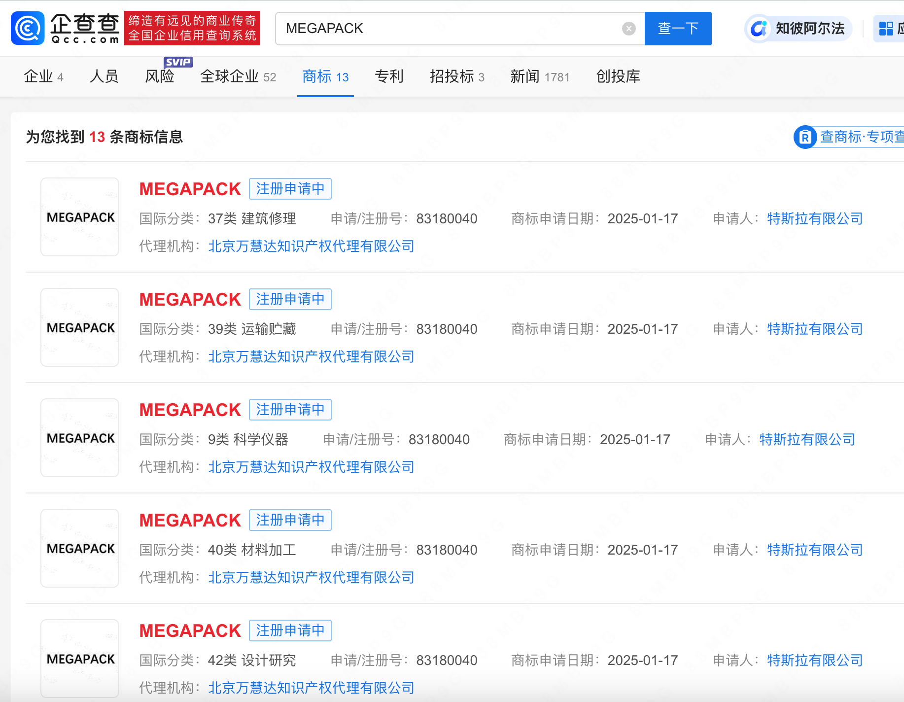 企查查APP显示,近日,特斯拉有限公司申请注册多枚“MEGAPACK”商标,国际分类为科学仪器、建筑修理等,当前商标状态均为注册申请中。