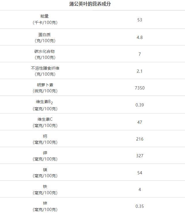 新鲜蒲公英叶的各种维生素含量都非常丰富,其中维生素C含量47毫克/100克,堪比柑橘类水果,也比马齿苋、荠菜、马兰头、香椿等其他“明星春菜”都高。