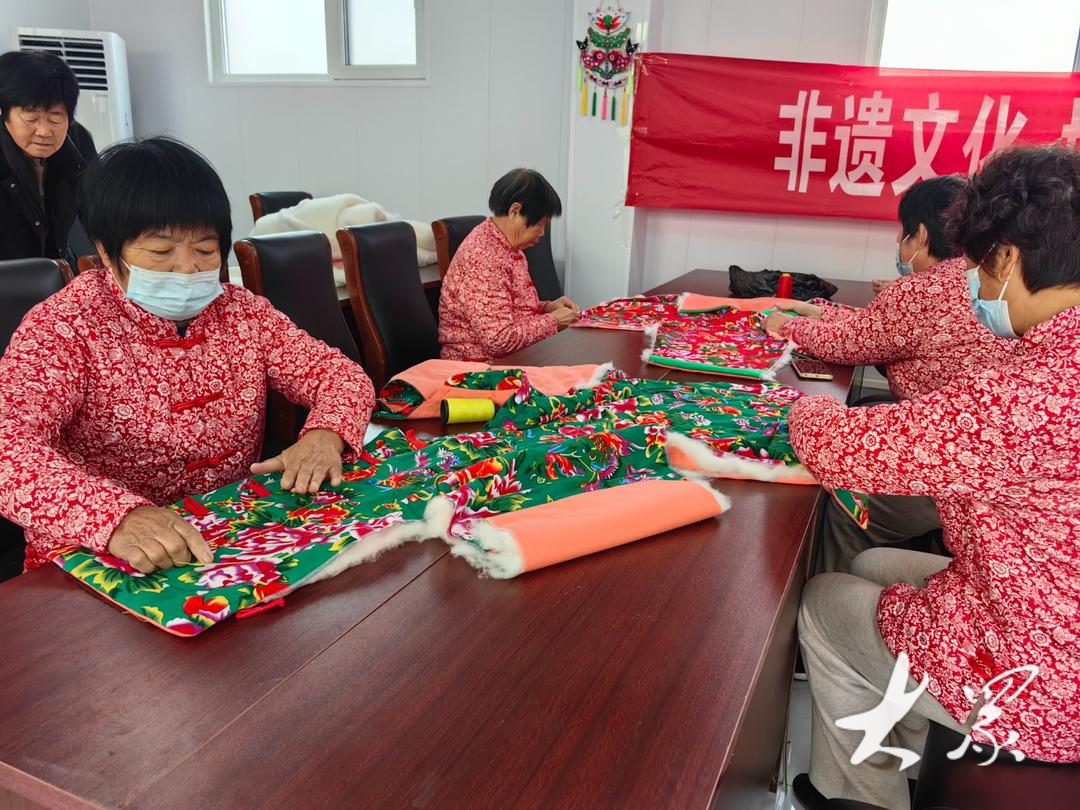 “乡绣加工周期长,产量有限,市场销路不稳定。为了带动更多村民增收,依托乡绣的老手艺,我们开始缝制市场销量更大的花棉袄。” 三座楼村工艺品农民专业合作社负责人隋桂云说。