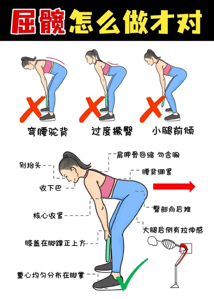 动作要点:腰背直立、膝盖蹬直后弯曲,膝盖弯曲时尽量不超过脚尖、膝盖伸直时不要刻意往后顶膝盖。