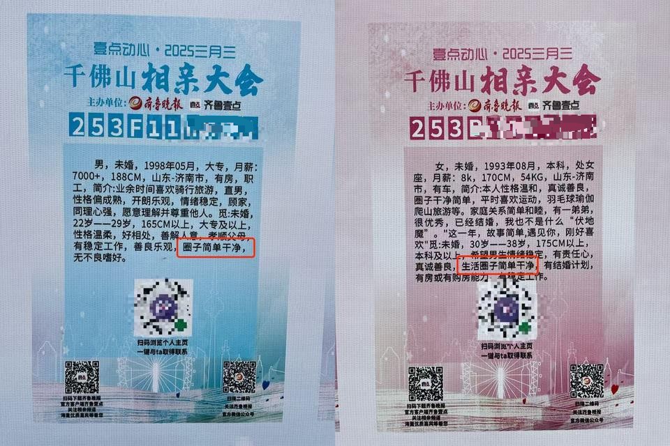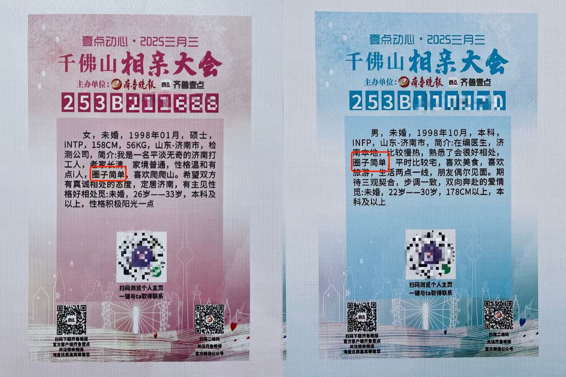 在相亲择偶中,你会对另一半的社交方式有要求吗?记者在千佛山相亲大会现场注意到,不少男女嘉宾在信息牌中介绍自己“圈子简单”,并希望对方同样“社交关系简单”、或“圈子干净”。