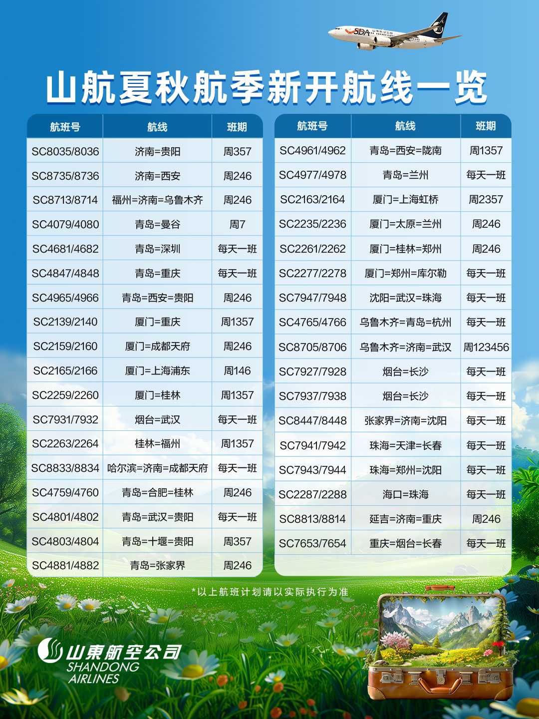 山航夏秋航季新开35条航线 助力旅客便捷出行