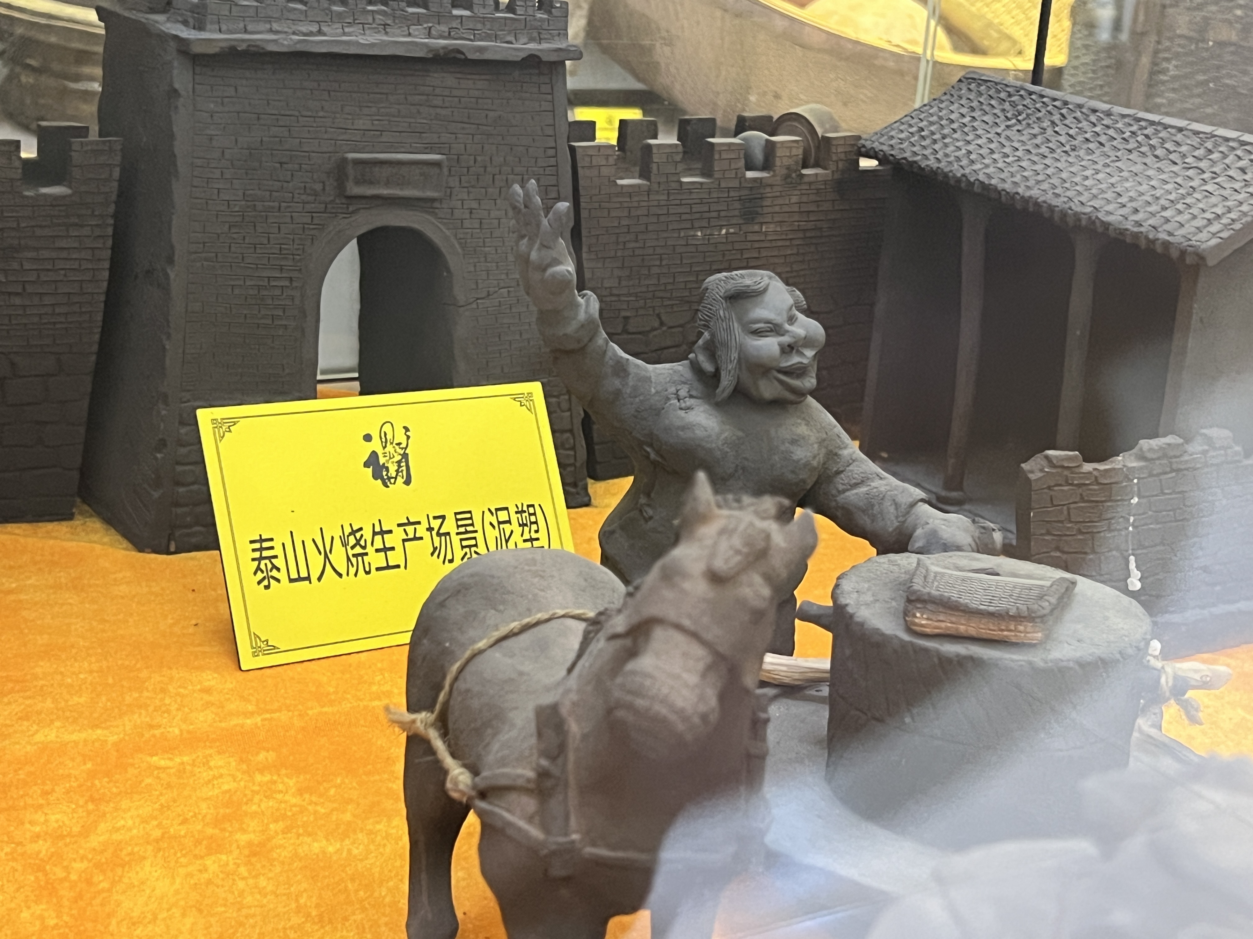 在泰山驴油火烧民俗文化博物馆里,一组泥人被放置在馆内最中心的位置,仔细一看,有的泥人在用石磨磨面,有的在揉面,有的在做火烧,有的在高声叫卖……这组泥人共78个,再现了泰山驴油火烧的制作流程。据泰山驴油火烧传承人李鹏介绍,这组作品出自新泰市一位手艺人,当时他吃到泰山驴油火烧后念念不忘,主动联系到他,要创作一组关于驴油火烧的泥塑。于是,李鹏来到这位手艺人家中,将驴油火烧的渊源以及制作工艺讲述给这位老人,两人攀谈许久。