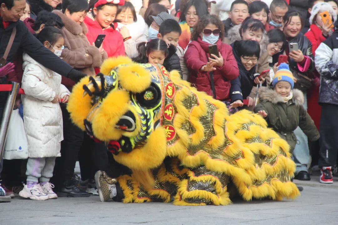 南狮贺礼:正门牌坊前,醒狮腾跃采青,锣鼓喧天闹春山。