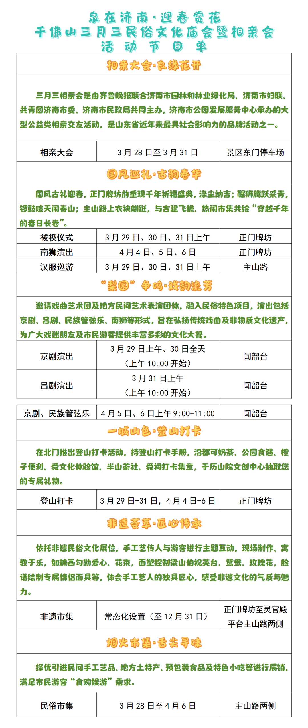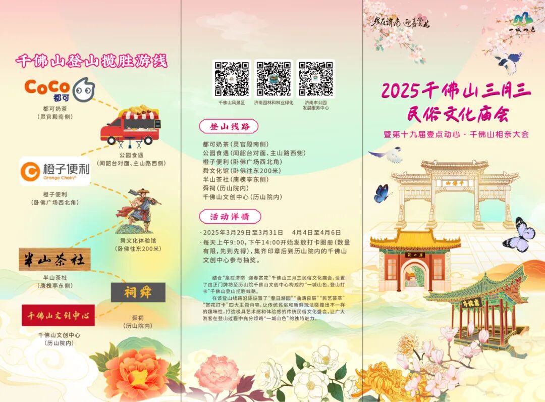 春山如笑,花朝有约!2025年3月28日至4月6日,千佛山景区举办“三月三民俗文化庙会暨相亲会”,以花为媒、以文会友,打造一场集传统民俗、非遗体验、浪漫交友于一体的春日盛宴,邀您共赴一场“可赏、可玩、可品、可恋”的春日光景!