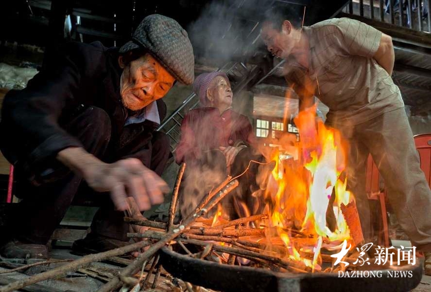 3月27日,广西巴马瑶族自治县甲篆镇兴仁村巴巷屯,105岁的黄祖新(左一)在生火做饭,老伴陆凤梅今年95岁,夫妻二人年龄相加200岁,现在已是五代同堂。