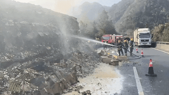 据了解,消防员到达现场时,货车的车尾位置正在燃烧,车上满载的鸡蛋散落一地整个路面狼藉不堪。