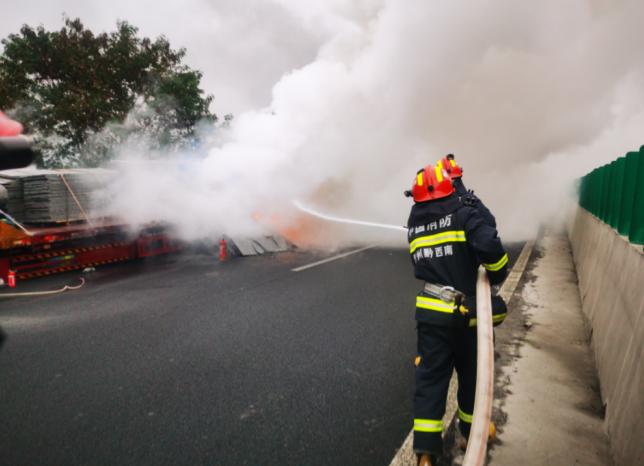 “熊熊烈火伴随浓烟笼罩桥面,刺鼻的焦糊味随风扩散……”消防救援人员抵达时看到,起火货车停靠在距离大桥20米左右位置,货车中段车底正处于猛烈燃烧阶段,火舌高达3米左右。因事发桥梁为交通要道,高速交警已实施双向临时管制,故后方滞留车辆已排起长龙。