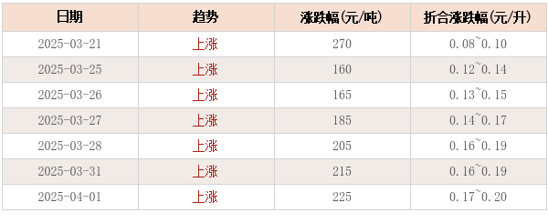回顾本次油价调整窗口的变化情况,从3月21日油价大跌超270元/吨开始,油价预测趋势便一路走高。进入3月下旬,油价上调预期逐渐增强,从最初的110元/吨涨至160元/吨,再到本周的205元/吨,直至今天的225元/吨,油价调整幅度不断扩大,呈现明显上涨态势。尽管此前油价有所波动,但此次上涨趋势强劲,成为本月油价调整的一大看点。