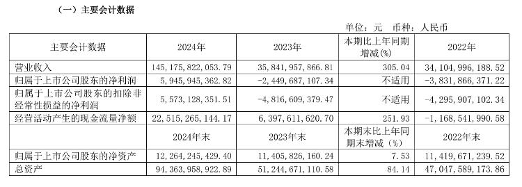2024年,赛力斯实现营业收入1451.76亿元,同比增长305.04%;归属于上市公司股东的净利润为59.46亿元,与2023年的-24.5亿元相比实现扭亏,子公司赛力斯汽车首次实现利润转正,成为全球第四家盈利的新能源车企;基本每股收益3.94元。