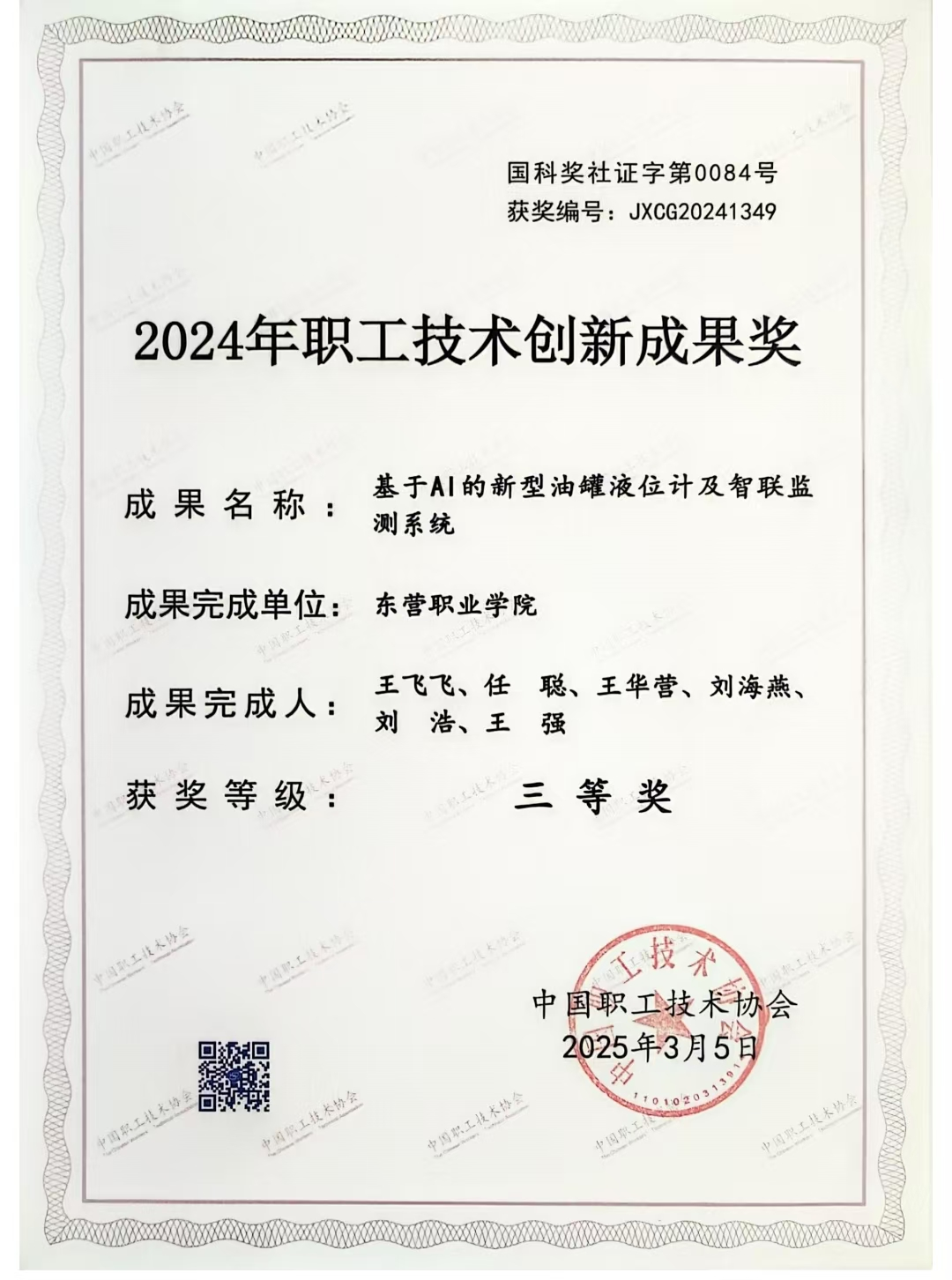 2025年3月5日,中国职工技术协会公布了2024年职工技术创新成果奖获奖名单,东营职业学院师生团队研发的“基于AI的新型油罐液位计及智联监测系统”项目荣获三等奖。这一国家级奖项不仅是对学校技术创新能力的肯定,更展现了“学徒制+”人才培养模式下学生实践能力与创新素养的显著提升。