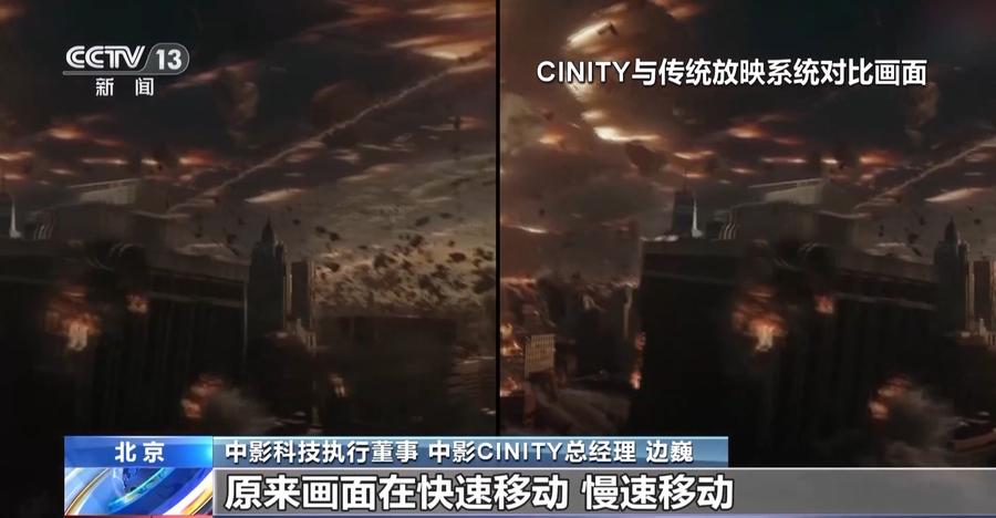 中影科技执行董事 中影CINITY总经理 边巍:我们把双眼的帧率提升到了120帧,也就是说每一秒钟每只眼睛前都有120帧的画面信息,这样的话就能非常明显地解决原来画面在快速移动,慢速移动或者相对移动过程中出现的画面的抖动、模糊、卡顿这些问题。我们也应用了最先进的激光技术,把我们的亮度比普通的银幕当时的放映亮度提高了5到7倍,这样整体的沉浸式观影效果就非常好。