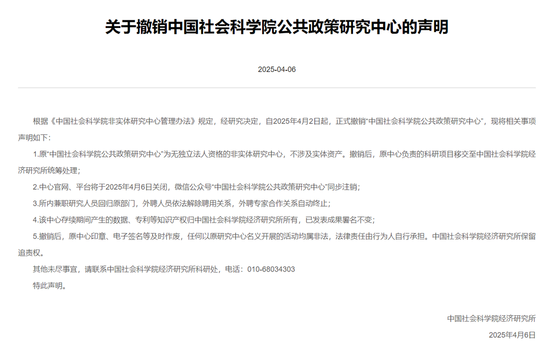根据《中国社会科学院非实体研究中心管理办法》规定,经研究决定,自2025年4月2日起,正式撤销“中国社会科学院公共政策研究中心”,现将相关事项声明如下: