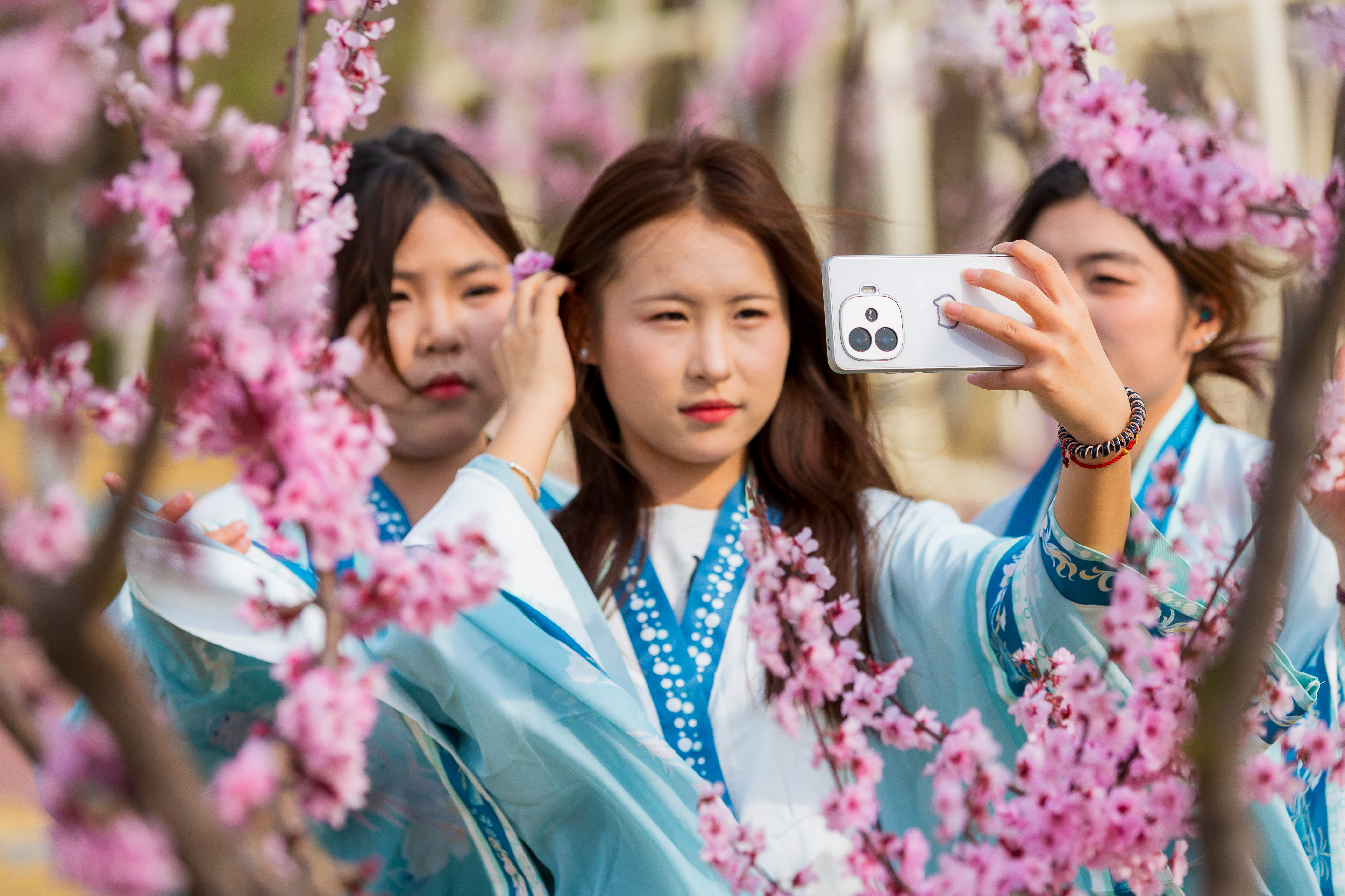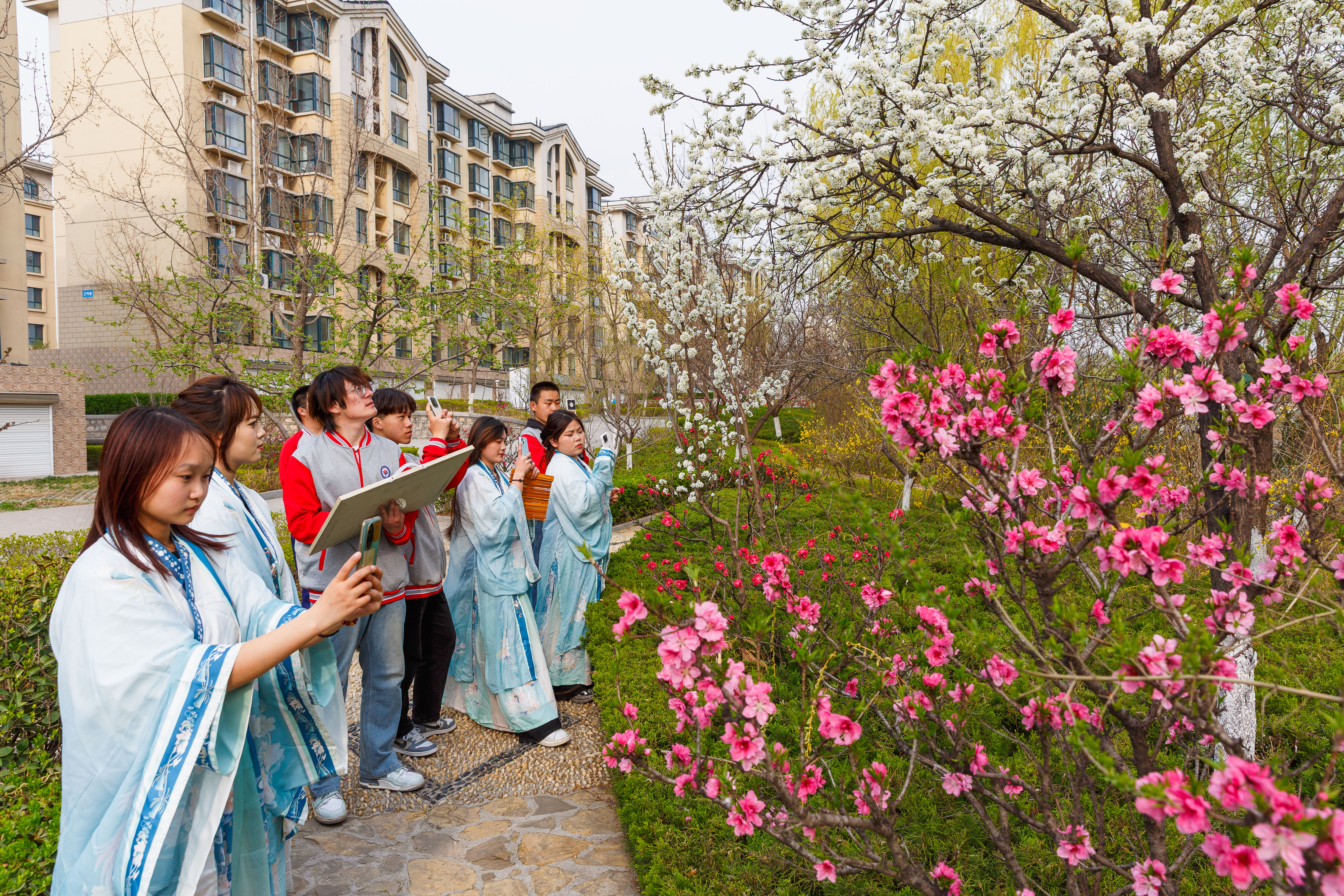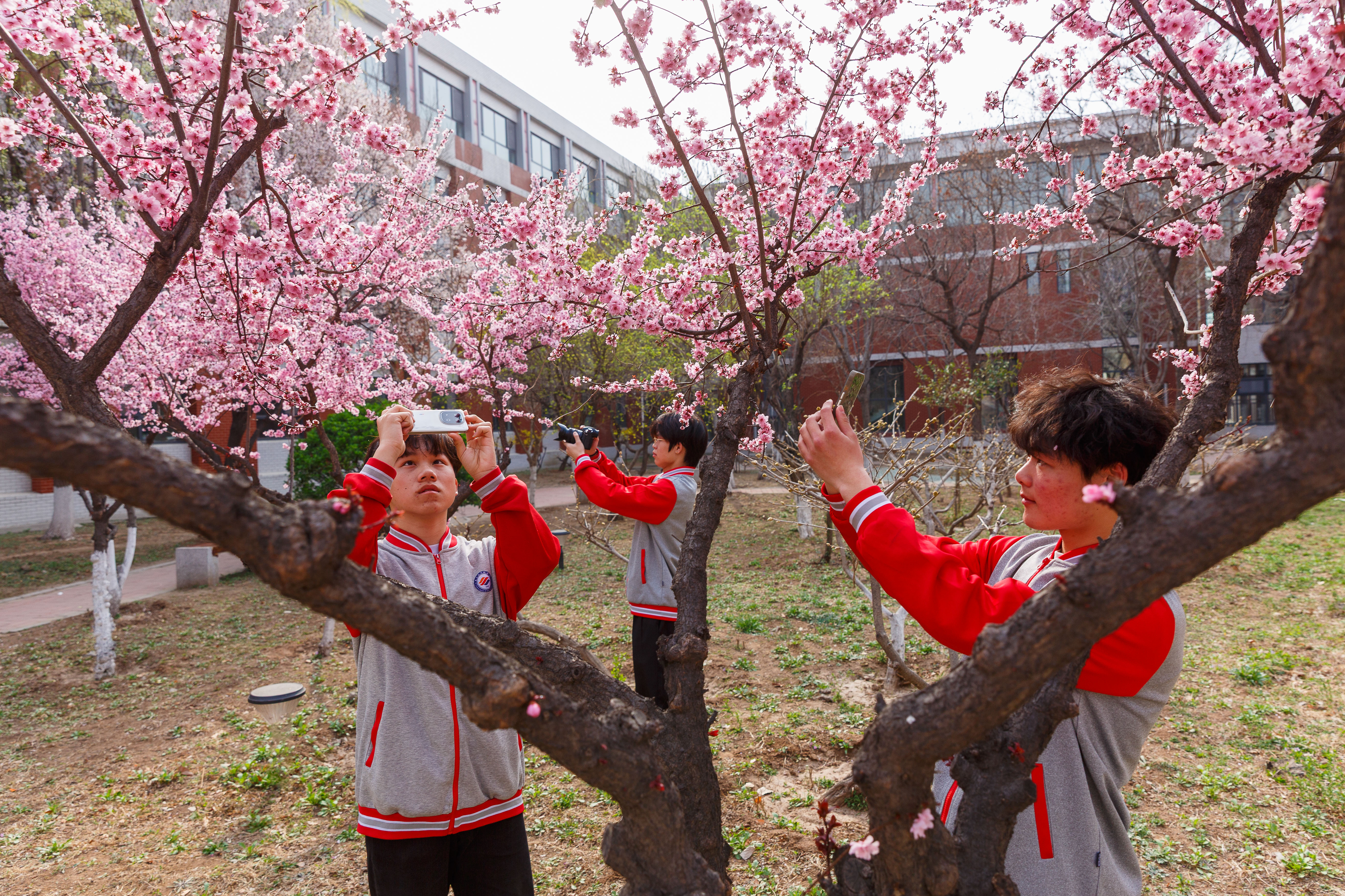 4月6日,位于淄博市淄川区的山东水利技师学院,学生们在校园内赏花游玩拍照。眼下,山东水利技师学院校园内的樱花、梅花、桃花、海棠花、梨花、紫叶李、玉兰花、连翘等竞相绽放,将校园妆扮成花的校园,满园春色。师生们行走在校园,仿佛置身花的海洋,尽情享受美好春天。