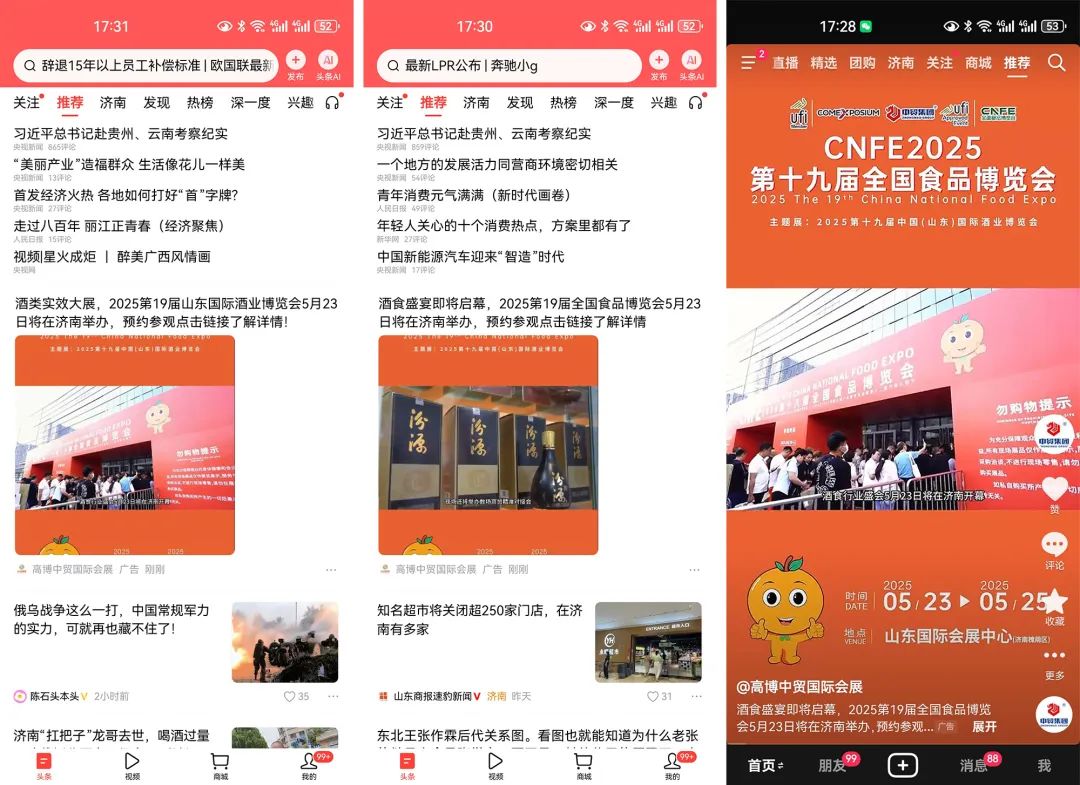 为此,全国食品博览会一方面联动媒体加大百度、微信平台的信息曝光力度,对展会新闻进行广泛传播;另一方面,大会组委会正针对抖音、今日头条平台进行精准广告投放,实现海量曝光,切实提升展会专业观众组织能力的进一步提升。