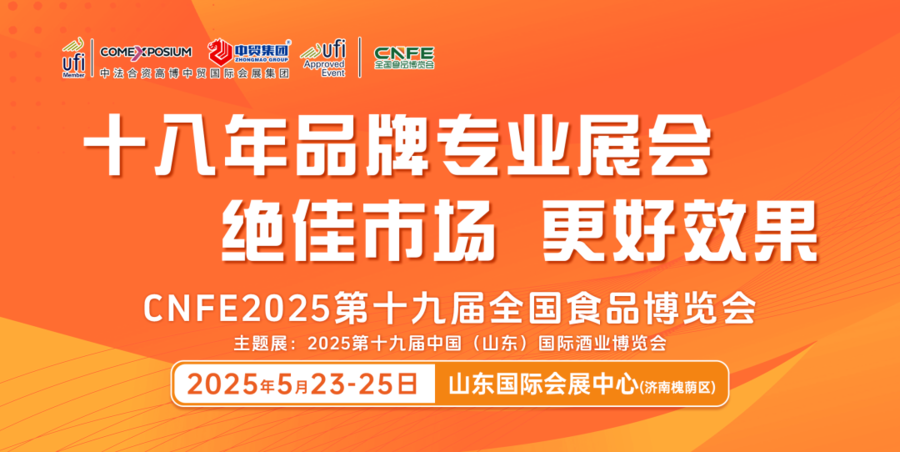 CNFE第十九届全国食品博览会将于5月23-25日在济南市山东国际会展中心盛大举办。【主题展:第十九届中国(山东)国际酒业博览会,同期展:ACE2025第三届亚洲餐饮展览会】