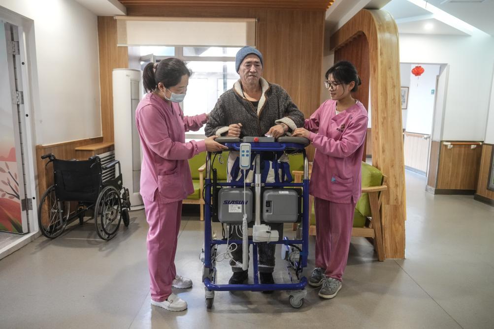 3月11日,沈阳市浑南区一家养老院内,护工在帮助一位老人使用新松公司生产的电动站立助行器。 新华社记者 潘昱龙 摄