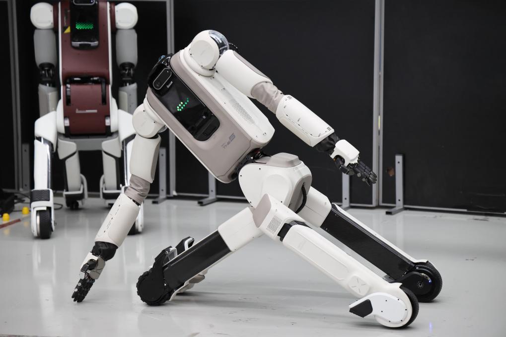 3月5日,在腾讯Robotics X实验室内,第五代机器人“小五”演示自动折叠收纳功能。 新华社记者 梁旭 摄