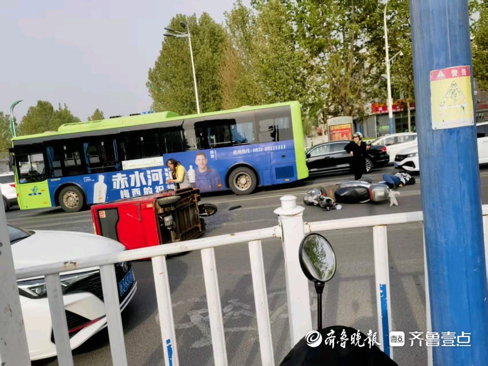 4月11日,情报员“渐入佳境”向齐鲁晚报官方客户端齐鲁壹点情报站发来报料,11日早晨7:50左右,在泰安市泰山区温泉路和南湖大街交叉口东北方向,一辆三轮车和一辆电动车发生碰撞,造成三轮车侧翻。