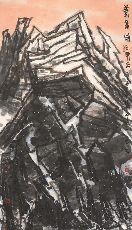 这种精神图谱被他抽象出相互交错、互为叠合的三角形、矩形和菱形,并以中心填堵或中心留白的方式为其基本的图式。他总是在画面的顶端制造出视觉挤压的心理感受,为此,他着力于画面中的山川沿着画边行走的构图方式。他的这种精神图谱显然具有重力感与压迫性,如在画面正中既以巨石结构填堵,也以中心或两侧开分的方法留出气孔。所谓重力感,就是以巨石堵住画面中心,形成下垂或悬浮的态势;所谓压迫感,就是画面山石互为堆垒、相互叠合,制造出相拥的密度和挤迫的紧促。毋庸置疑,他的这种精神图式的建构便是来自西北山川的心理感受,却又通过视觉形式重建的精神场域。