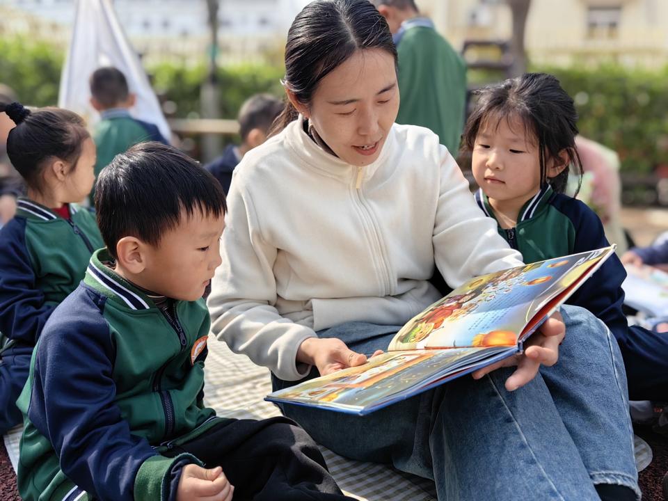 活动现场,孩子们围坐草坪,在暖阳与青草的陪伴下翻开绘本。老师们绘声绘色讲述故事,生动演绎角色,孩子们听得入迷,积极互动。