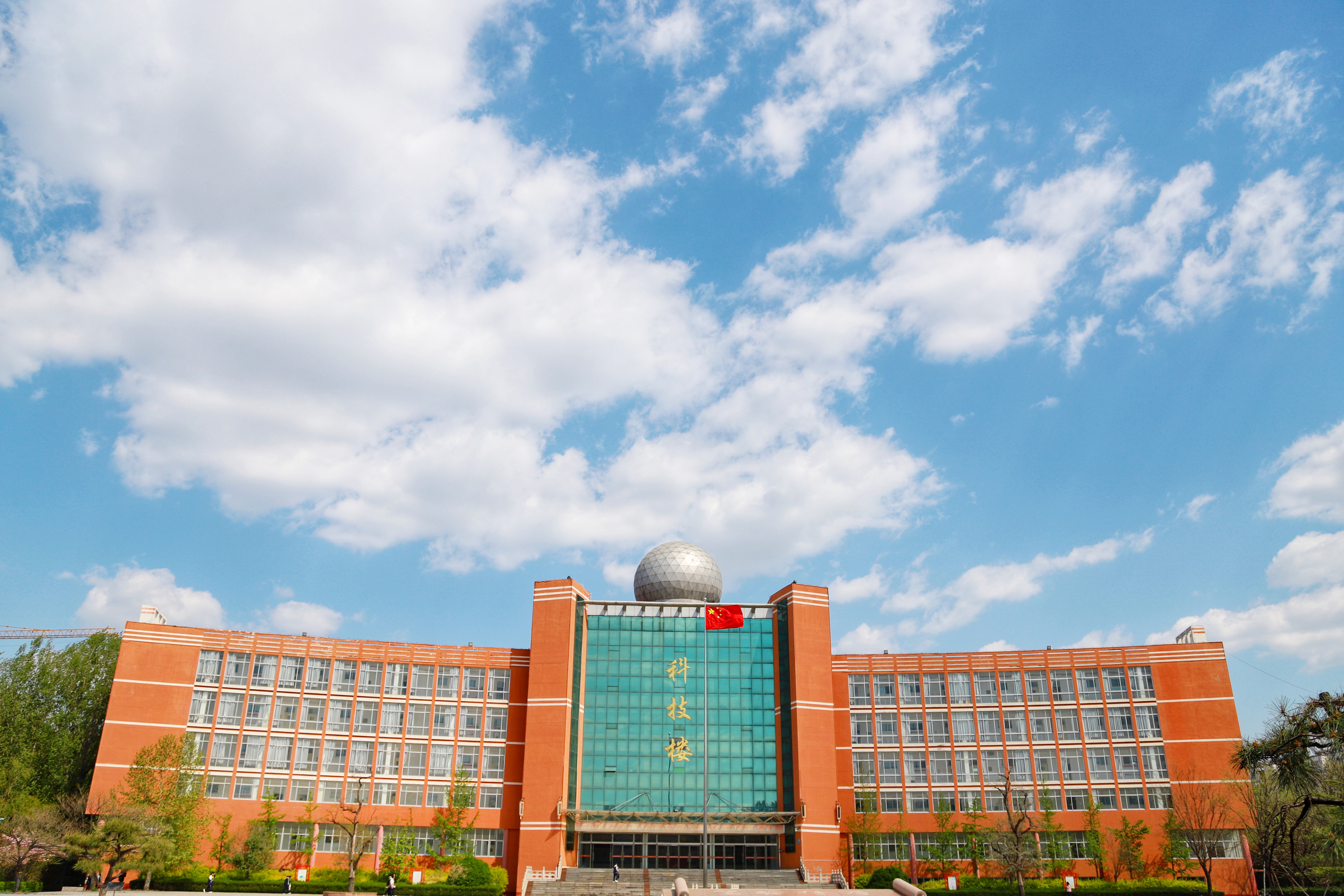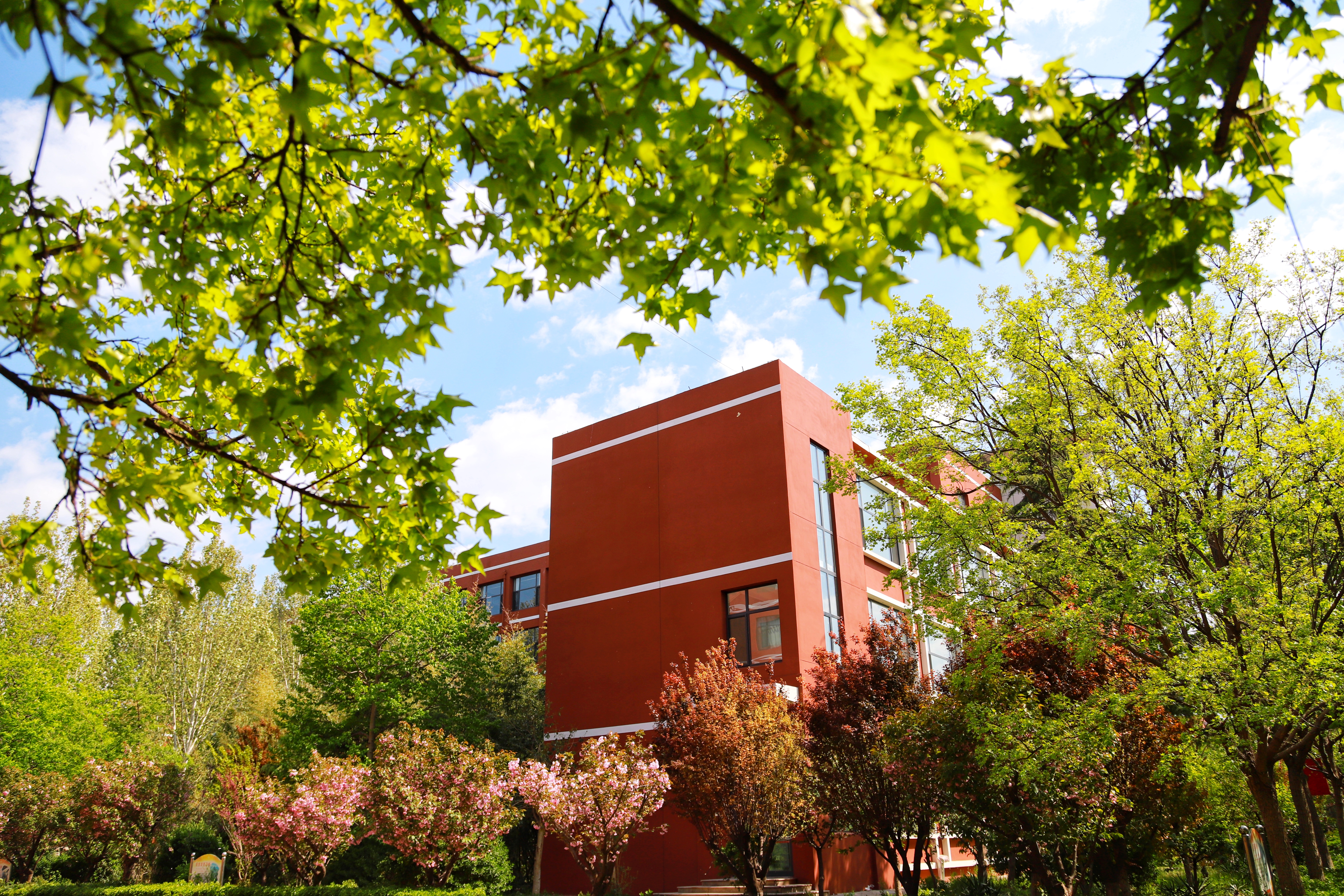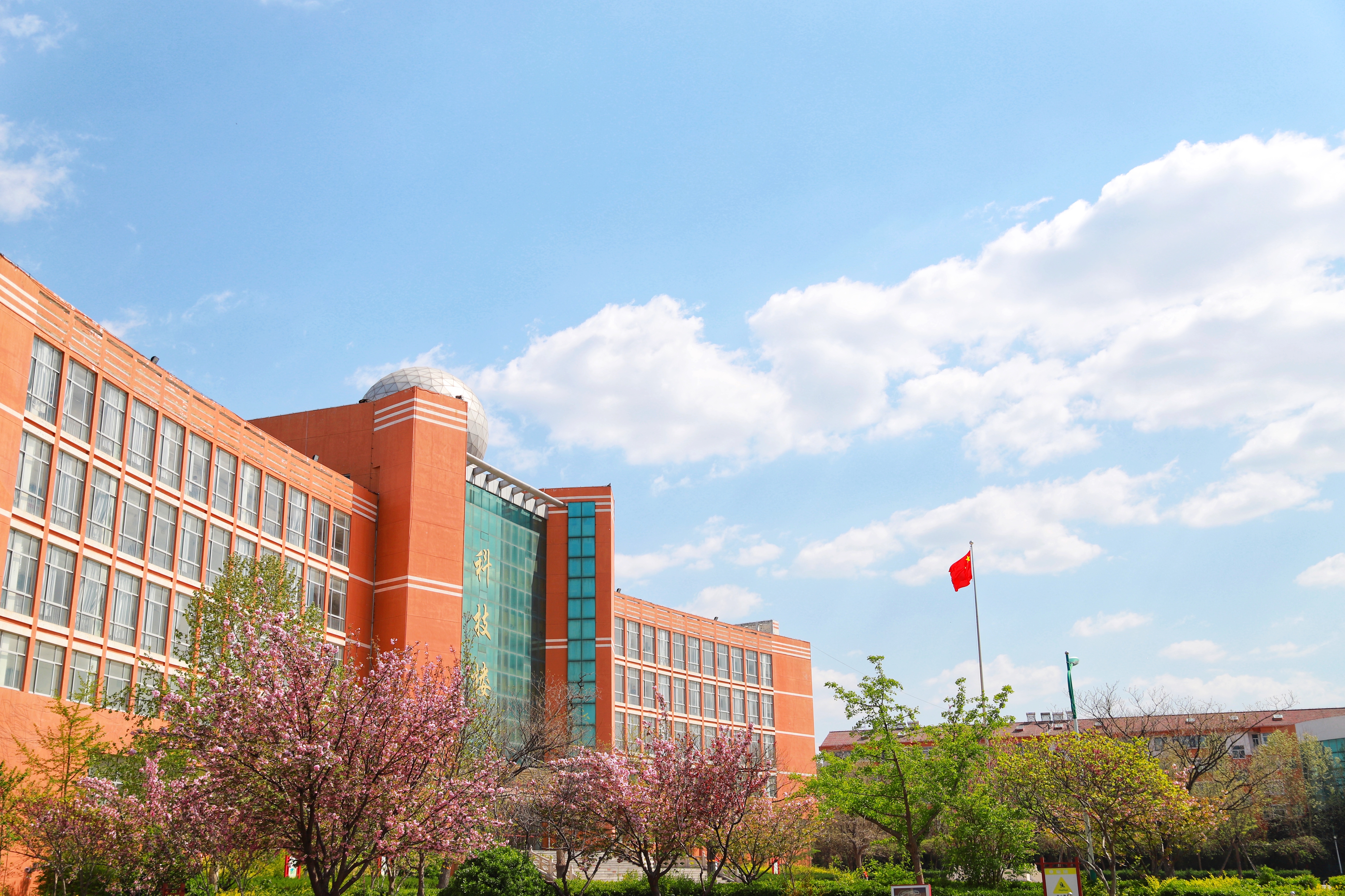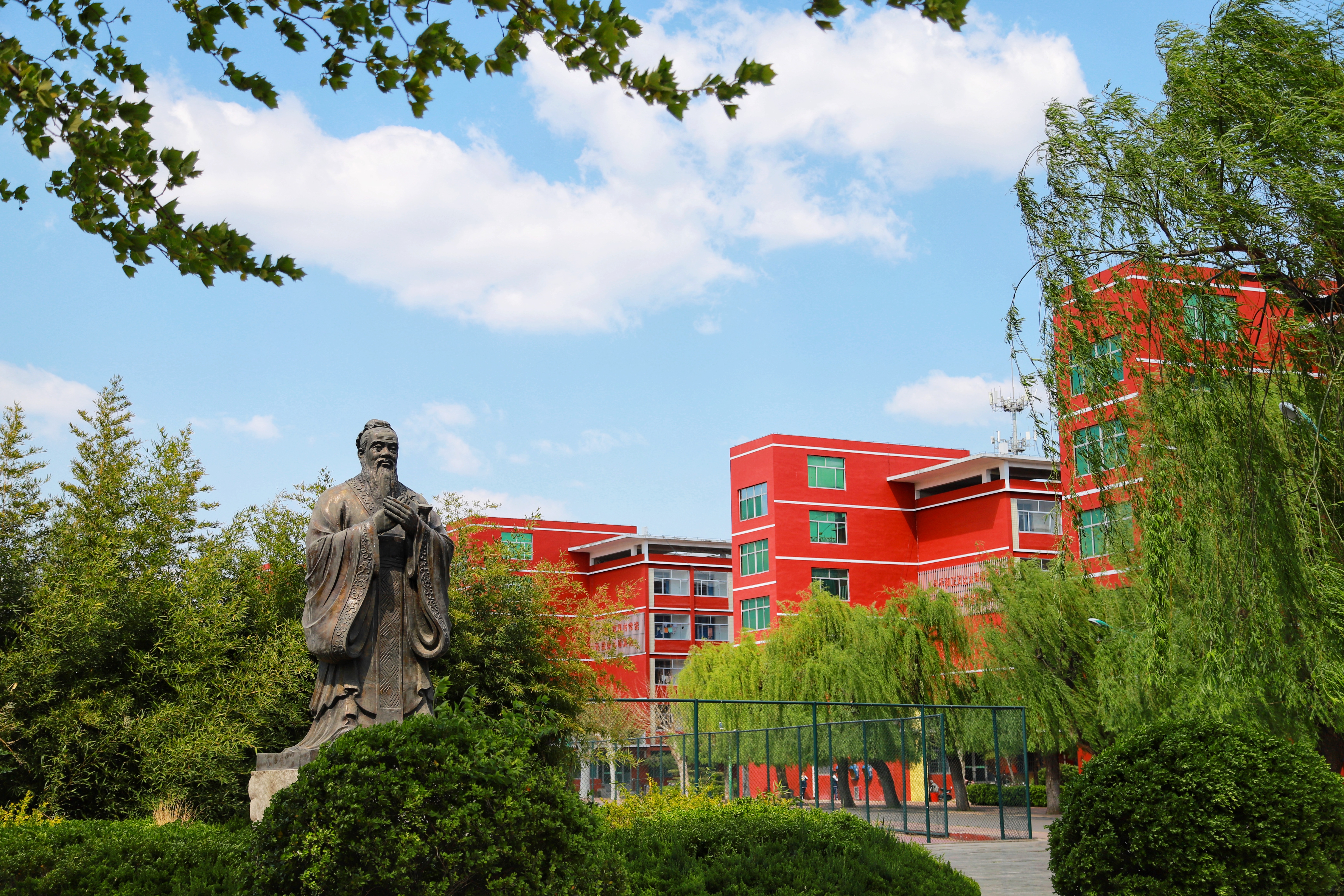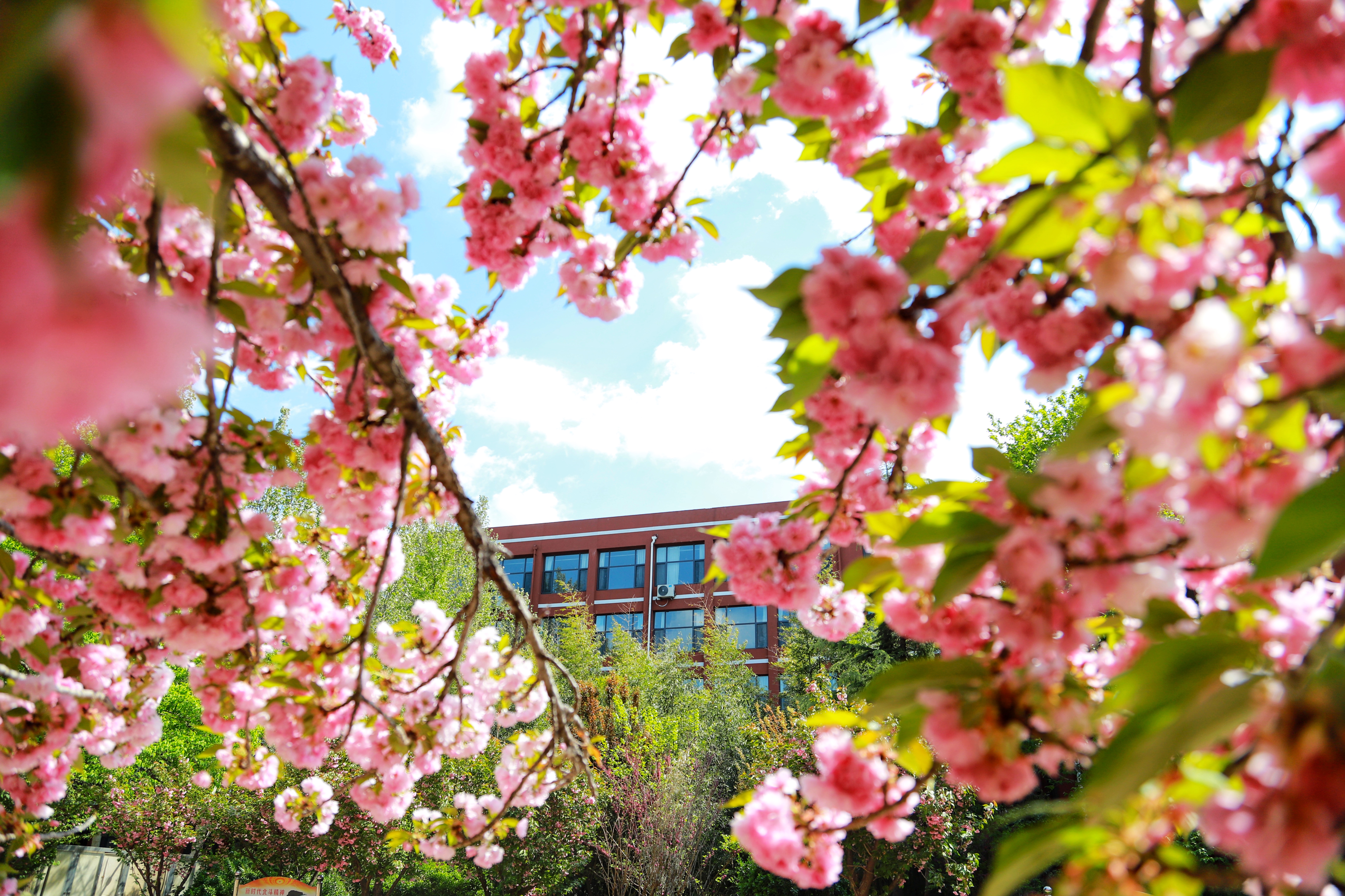 蓝天白云下,青州第二中学春日的美丽校园。