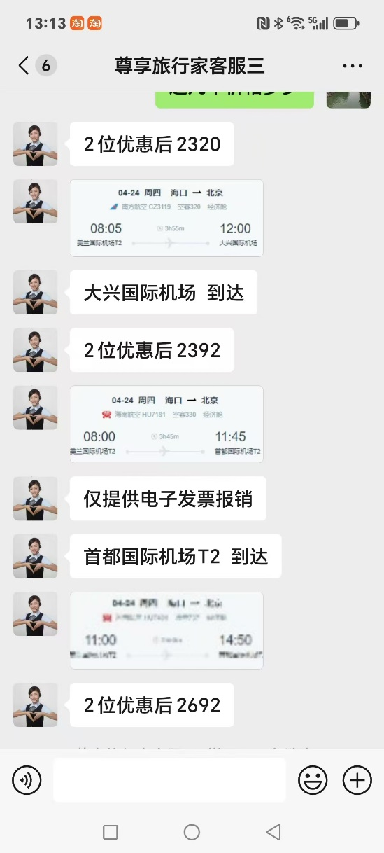 石女士辗转联系到客服后得到的报价显示,虽然南航价格有所变动,但4月24日海南航空两个航班的“优惠价”都比官网报价还贵(相关截图)