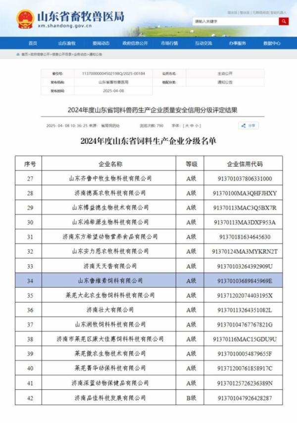 近日,2024年度饲料兽药生产企业质量安全信用分级评定结果正式发布,鲁商集团所属鲁维素获评“山东省饲料生产企业信用分级A级企业”。