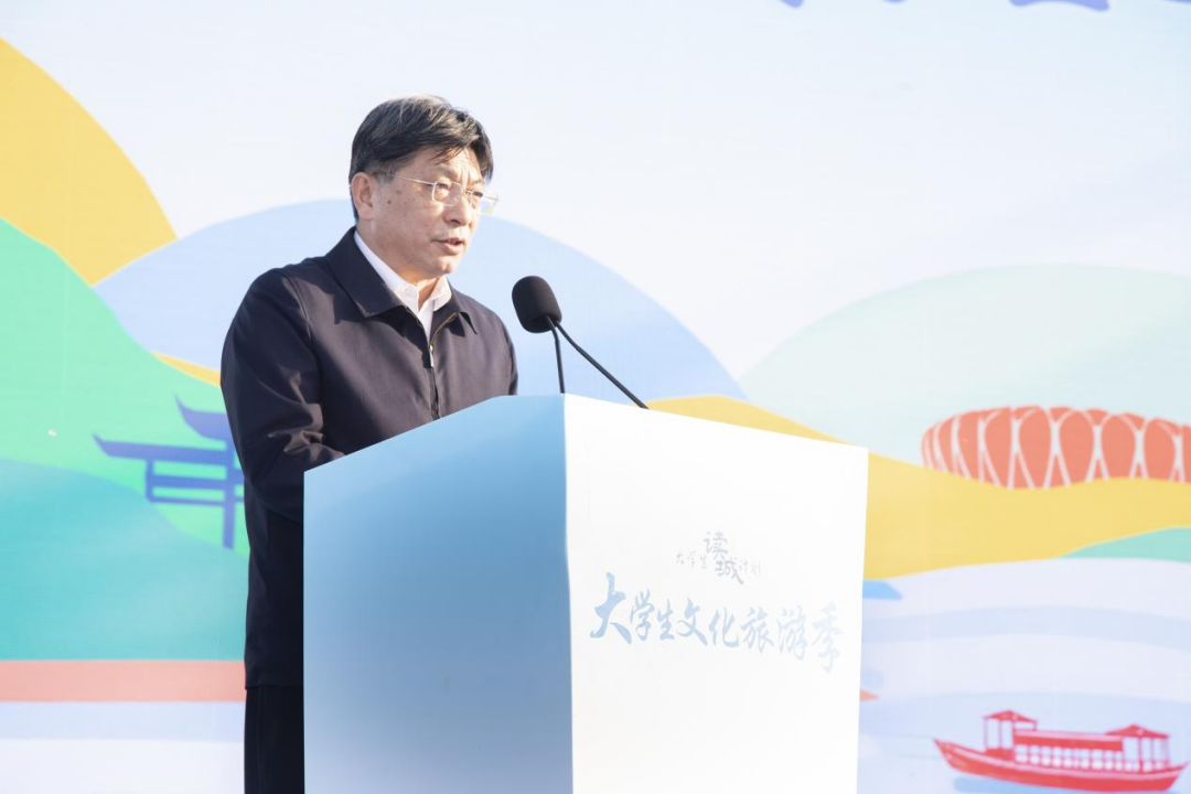 济南市副市长任广锋致辞,他表示启动“大学生读城计划”暨2025大学生文化旅游季,旨在通过举办一系列丰富多彩的文旅活动,用融媒分享课、青春文旅市集、文旅赛事、体验打卡等清新潮流的新玩法,让同学们更加深入地了解济南、感知济南、读懂济南,从而激发大家热爱济南、宣传济南、建设济南的热情。今年活动还将带着泉城美景和好物在驻济高校巡演,以最贴近青年群体的互动形式与传播方式,为大家推出系列精彩纷呈的文旅体验。