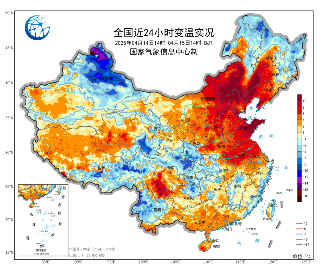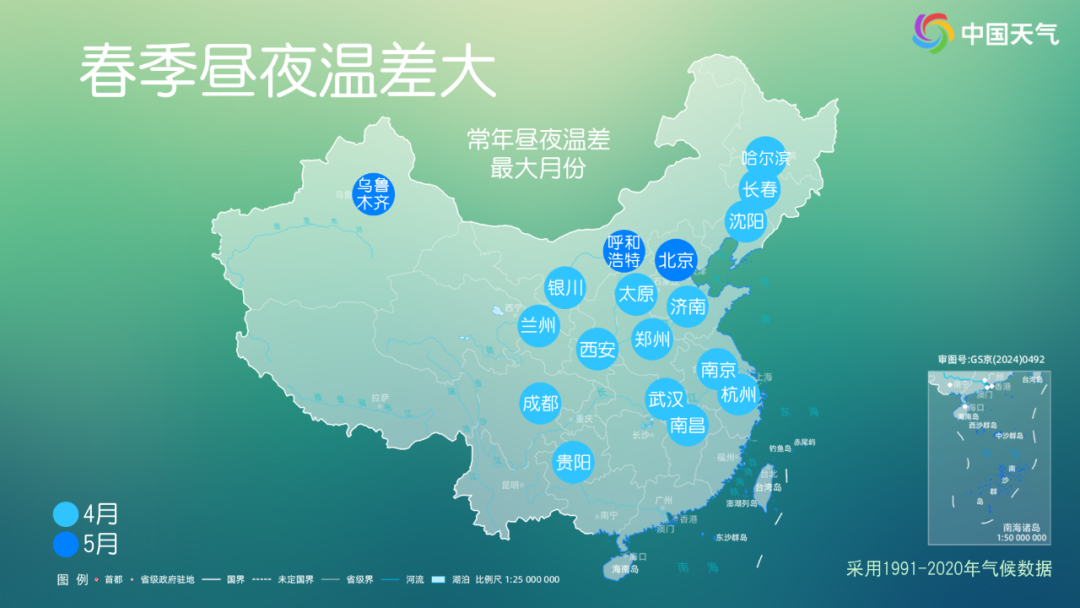 ↑ 常年平均来看,4~5月也是中东部大部昼夜温差最大的时候。
