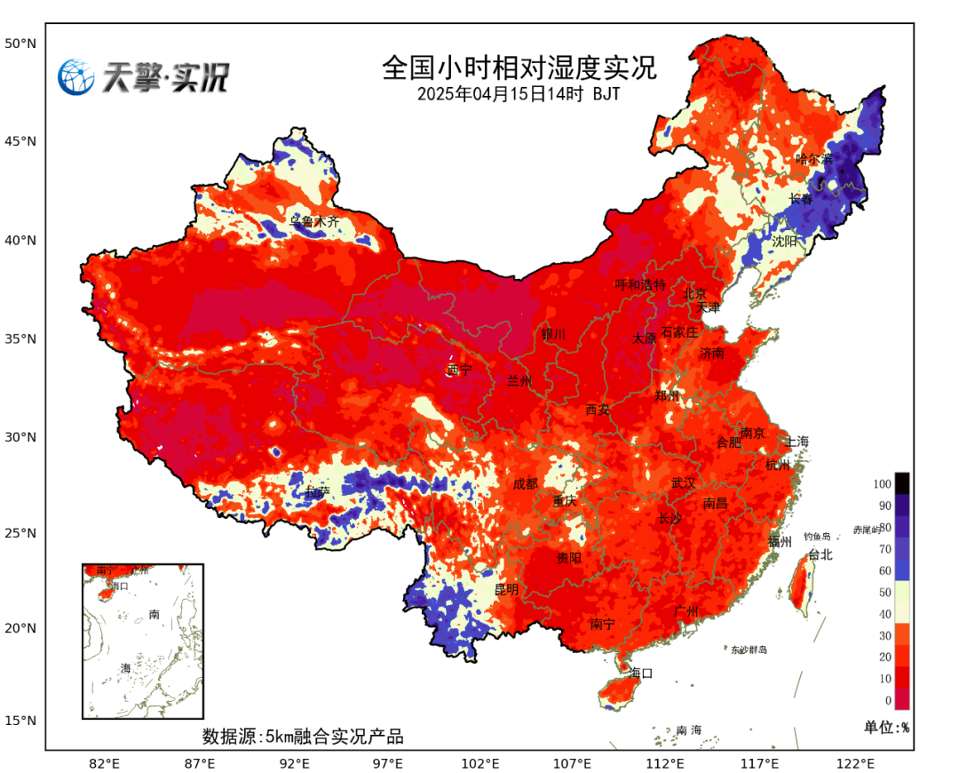 晴朗、暖热、干燥是这两天的统一天气特征。看今天14时相对湿度实况图,全国大部一片红红彤彤,相对湿度普遍不足30%。