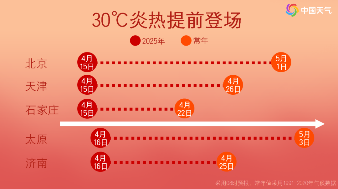 明天暖热继续,华北、黄淮等多地将现同期少见、甚至罕见暖热。济南、太原将迎来今年首个30℃+,郑州、石家庄将向“北方省会城市史上最早高温纪录”发起挑战,此外,西安明后天也有望冲击高温。